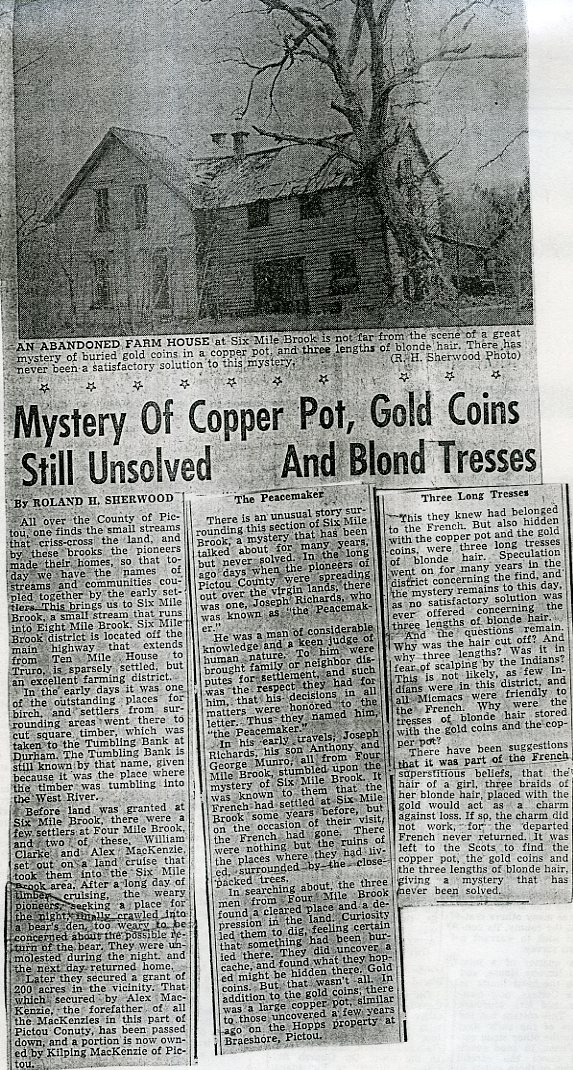 An Abandoned Farm house at Six mile Brook is not far from the scene of a great mystery of buried gold coins in a copper pot, and three lengths of blonde hair. There has never been a satisfactory solution to this mystery.