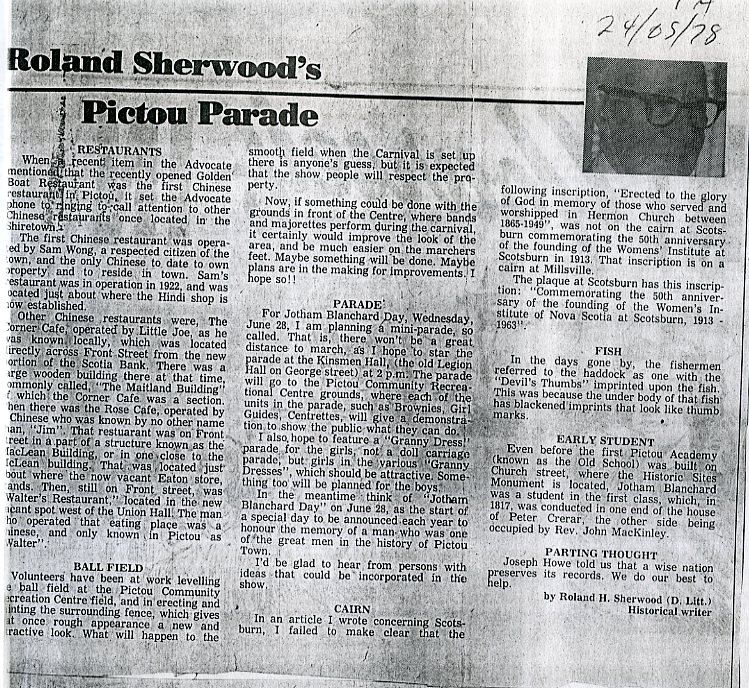 | Tags: | Roland sherwood, Pictou, Sam wong, Jotham Blanchard, Rev. John MacKinley, Joseph Howe |