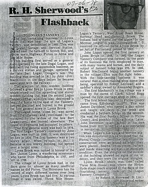 The last remaining business in Lyons Brook was near the site of Logan’s Tannery, was demolished in 1968. This was the Logan Garage and Service Station, located near the turn-off to Scotch Hill and on the main Highway Pictou to Alma and Ten Mile House.