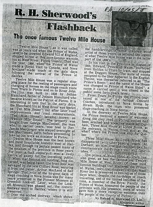“Twelve Mile House”, as it was called, was 22 years old when the Prince of Wales, later to be crowned Edward VII of England, stopped to rest at this once-famous wayside inn at West River, Pictou County. That was the year, 1860, when the Prince of Wales made a Royal Visit to Canada, and Nova Scotians made much of the gala days following the arrival of the Prince at Halifax.