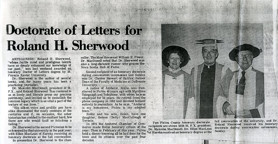 Antigonish: Roland H. Sherwood “whose fertile mind and prodigious talents have so deeply enhanced our knowledge of the past,” was last weekend awarded an honorary Doctor of Letters degree by St. Francis Xavier University.
