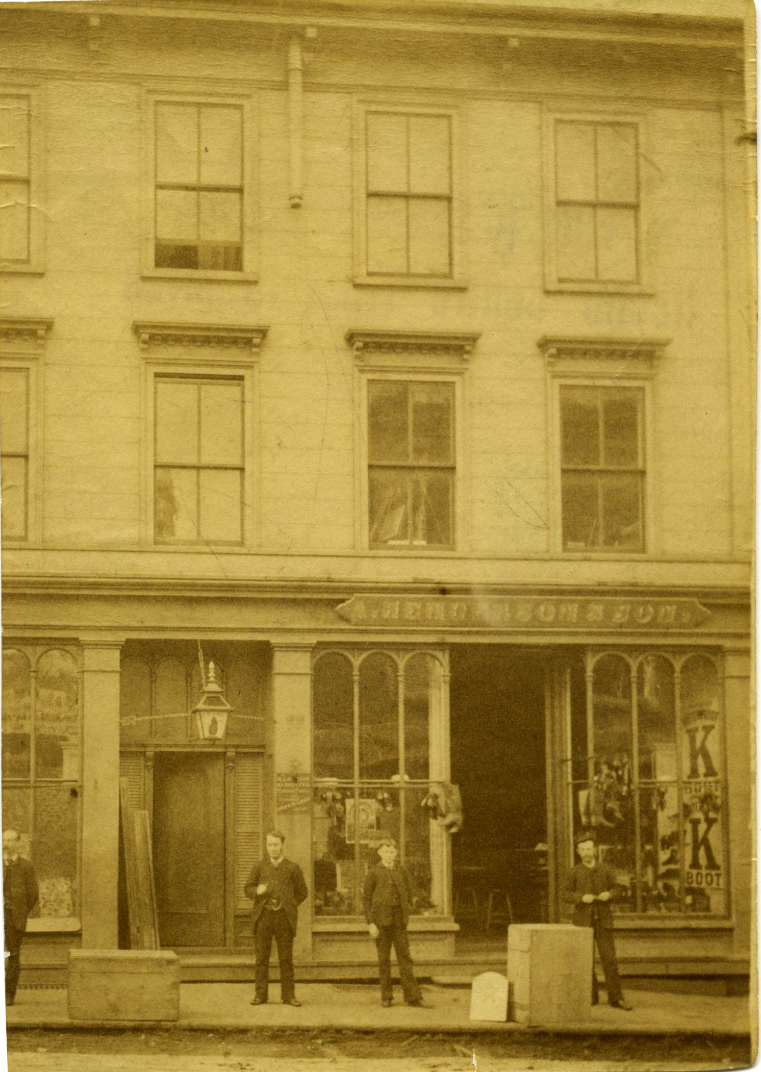 Three older and one young man standing on wooden sidewalk in front of three story builidng that houses the store of A. Henderson & Son