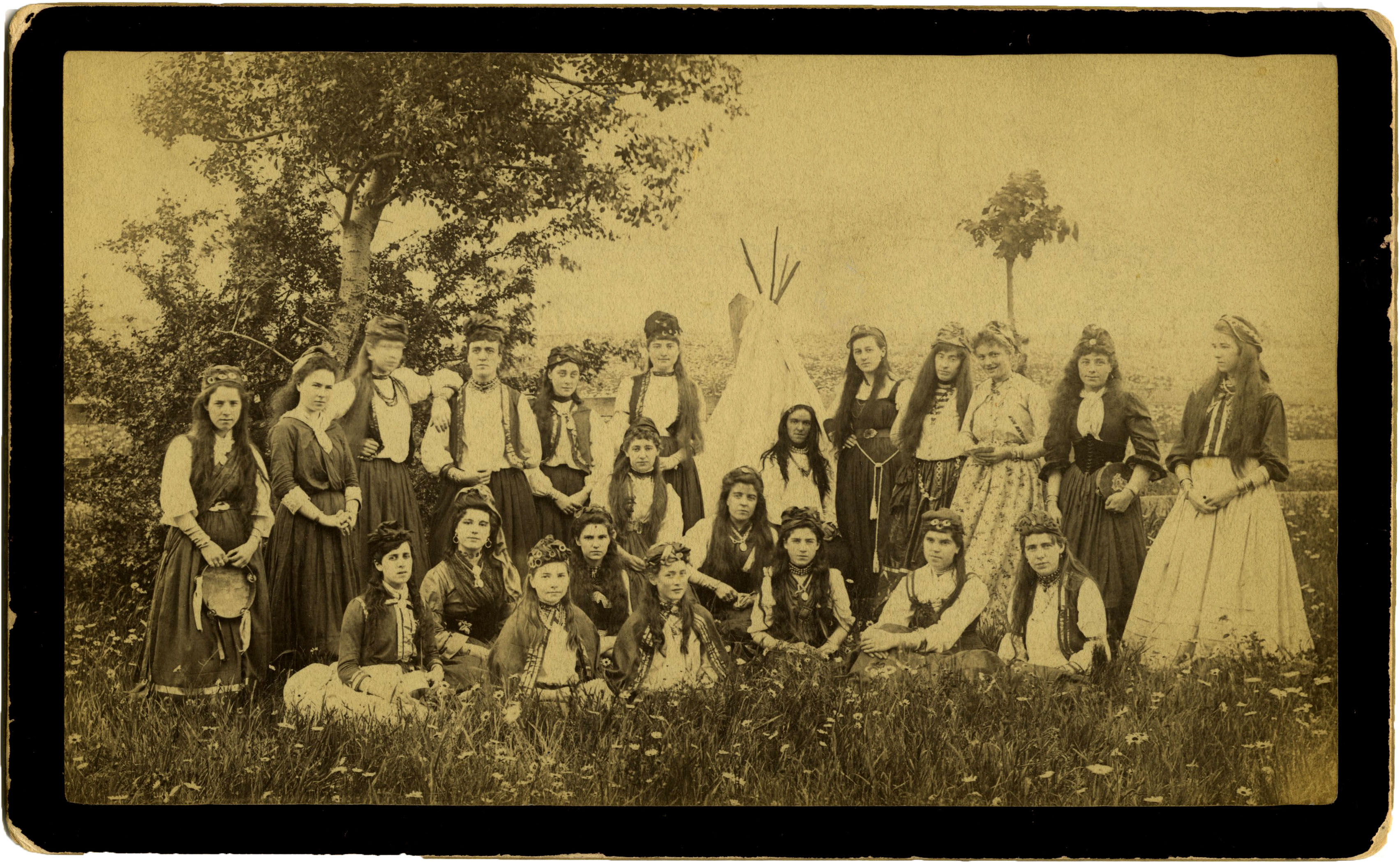 Twenty two young women elaborately dressed psoing in a field around a small wigwam. (hard to tell if the covering is birch or a canvas)