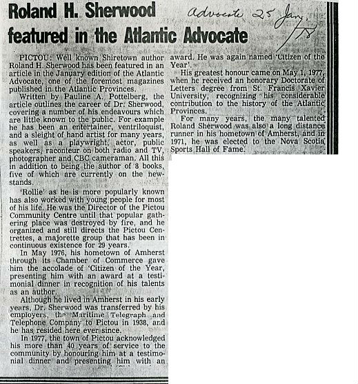 PICTOU: Well known Shiretown author Roland H. Sherwood has been featured in an article in the January edition of the Atlantic Advocate, on of the foremost magazines published in the Atlantic Provinces.