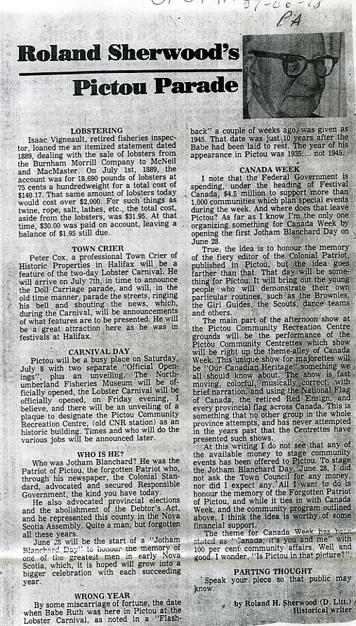 At this writing I do not see that any of the available money to stage community events has been offered to Pictou. To stage the Jotham Blanchard Day, June 28, I did not ask the Town Council for any money, nor did I expect any. All I want to do is honour the memory of the Forgotten Patriot of Pictou, and while it ties in with Canada Week, and the community program outlined above, I think the idea is worthy of some financial support.