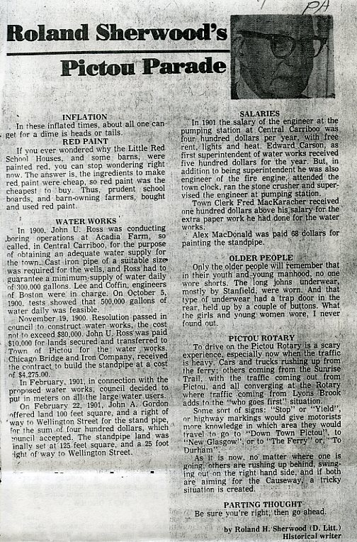 November 19, 1900 Resolution passed in council to construct water works, the cost not to exceed $80,000. John U. Ross was paid $10,000 for lands secured and transferred to Town of Pictou for the water works Chicago Bridge and Iron Company, received the contract to build the standpipe at a cost of $4,275.00.