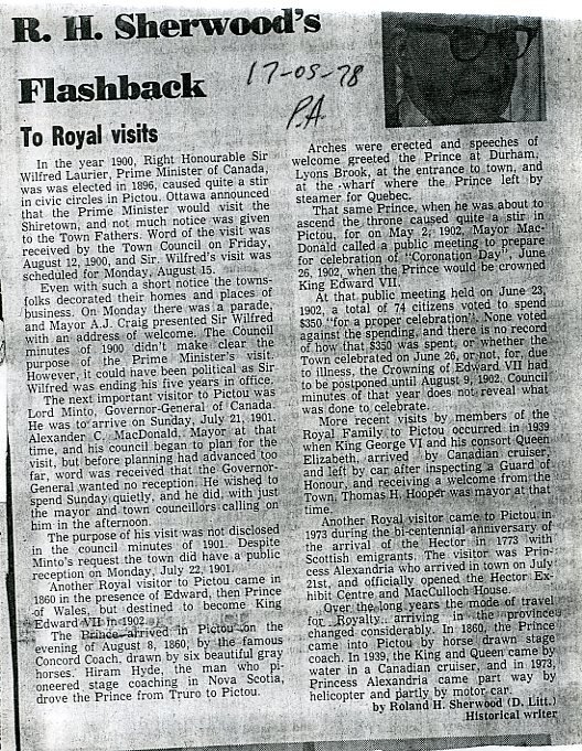 | Tags: | Sir Wilfred Laurier, A.J. Craig, Lord Minto, Alexander C MacDonald, King Edward VII, Hiram Hyde, King George VI, Queen Elizabeth, Thomass Hooper, Princess Alexandria, Roland Sherwood, Pictou |
