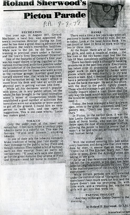 One year ago, in August 1977, Gerard MacIssac, a local boy was appointed the town’s recreation director. During his first year he has done a great deal to advance and co-ordinate the town’s recreation facilities. While new to the job, he did have some training in previous years under a former, and the town’s first Recreational Director.