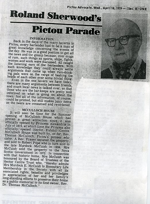 It will soon be time for Summer opening of McCulloch House which has proven great attraction since it was officially opened by princess Alexandria in July of 1973, at which time the Princess also officially opened Hector Exhibit Center. McCulloch House was built by, or for, Rev. Thomas McCulloch, Pictou’s Pioneer educator. A Rev. Fraser secured the property, and sold to the late Murdock McCuish in 1934. Mrs. McCuish sold the property to the Nova Scotia Government in 1972. In connection with that historic home, Mrs. McCuish was honored by the Board of Trustees of the Hector Center Trust who, “Hereby admits Mrs. Murdock E. McCuish to Honourary Life Membership in the Society, with all its associated rights, benefits and privileges in appreciation of her and her family’s long-standing efforts to preserve their home as a public memorial to its first owner, Rev. Dr. Thomas McCulloch.”