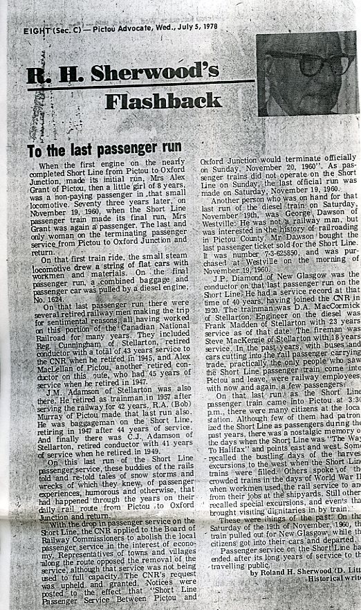 When the first engine on the nearly completed Short Line from Pictou to Oxford Junction, made its initial run, Mrs Alex Grant of Pictou, then a little girl of 8 years, was a non-paying passenger in that small locomotive. Seventy three years later, on November 19, 1960, when the Short Line passenger train made its final run, Mrs Grant was again a passenger. The last and only woman on the terminating passenger service from Pictou to Oxford Junction and return.