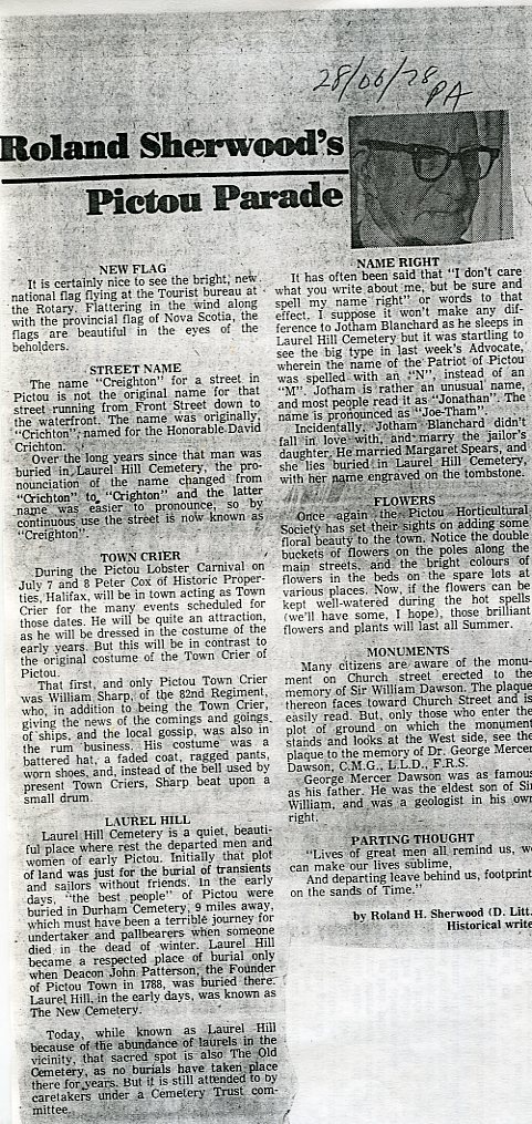 It has often been said that “I don’t care what you write about me, but be sure and spell my name right” or words to that effect. I suppose it won’t make any difference to Jotham Blanchard as he sleeps in Laurel Hill Cemetery but it was startling to see the big type in last week’s Advocate, wherein the name of the Partriot of Pictou was spelled with an “N”, instead of an “M”. Jotham is rather an unusual name, and most people read it as “Johnathan”. The name is pronounced as “Joe-Tham”.