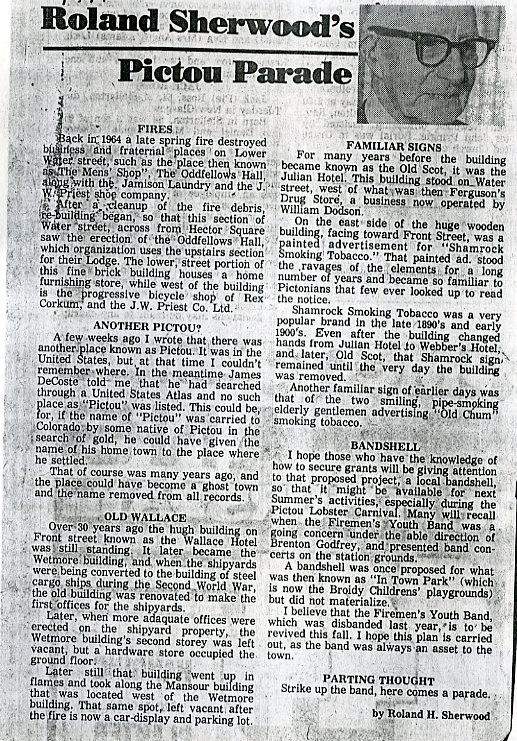 I hope those who have the knowledge of how to secure grants will be giving attention to that proposed project, a loacal bandshell, so that it might be available for next Summer’s activities, especially during the Pictou Lobster Carnival. Many will recall when the Firemen’s Youth Band was a going concern under the able direction of Brenton Godfrey, and presented band concerts on the station grounds