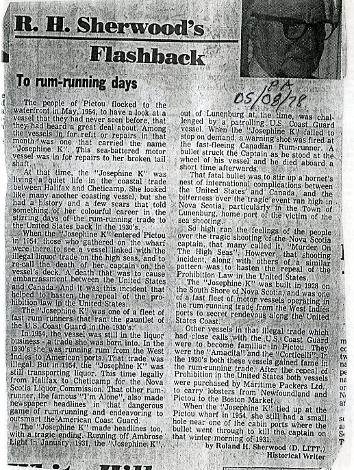 The “Josephine K” was built in 1928 on the South Shore of Nova Scotia, and was one of a fast fleet of Nova Scotia, and was one of a fast fleet of motor vessels operating in the rum- running trade from the West Indies ports to secret rendezvous along the United States Coast.