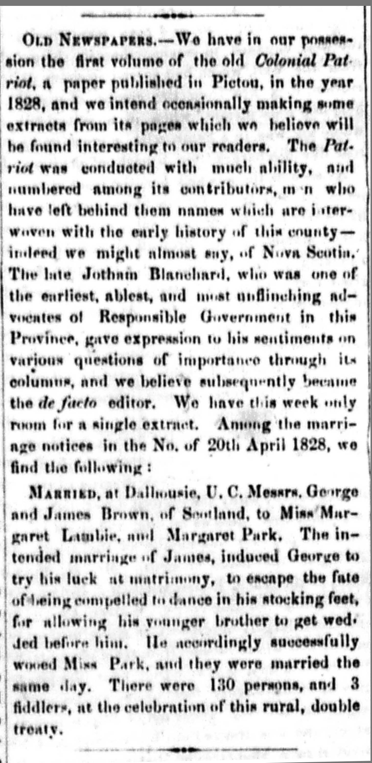 MARRIED, at Dalhousie, U.C. Messrs, George and James Brown, of Scotland, to Miss Margaret Lambie, and Margaret Park. The intended marriage of James, induced George to try his luck at matrimony, to escape the fate of being compelled to dance in his stocking feet, for allowing his young brother to get wedded before him. He accordingly successfully wooed Miss Park, and they were married the same day. There were 130 persons, and 3 fiddlers, at the celebration of this rural, double treaty.