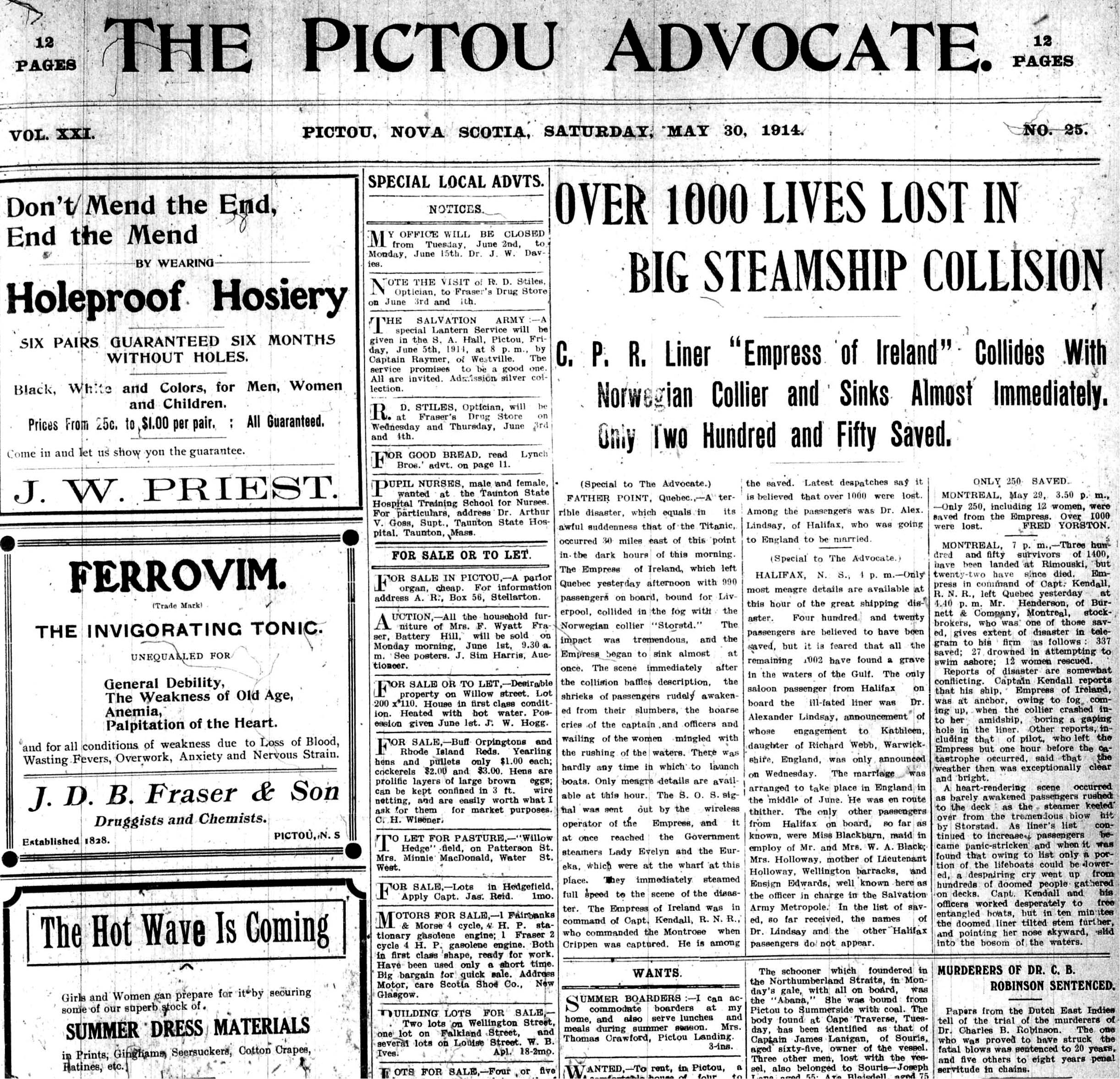 Father Point, Quebec.,—A terrible disaster, which equals in its awful suddenness that of the Titanic, occurred 30 miles east of this point in the dark hours of this morning. The Empress of Ireland, which left Quebec yesterday afternoon with 990 passengers on board, bound for Liverpool, collided in the fog with the Norwegian collier "Storstd." The impact was tremendous, and the Empress began to sink almost at once. The scene immediately after the collision baffles description, the shrieks of passengers rudely awakened from their slumbers, the hoarse cries of the captain and officers and wailing of women mingled with the rushing of the waters. There was hardly any time in which to launch boats. Only meagre details are available at this hour. The S.O.S. signal was sent out by the wireless operator of the Empress, and it at once reached the Government steamers Landy Evelyn and the Eureka, which were at the warf at this place. They immediately steamed full speed to the scene of the disaster. The Empress of Ireland was in command of Capt. Kendall, R.N.R., who commanded the Montrose when Crippen was captured. He is among the saved. Latest despatches say it is believed that over 1000 were lost. Among the passengers was Dr. Alex. Lindsay, of Halifax, who was going to England to be married.