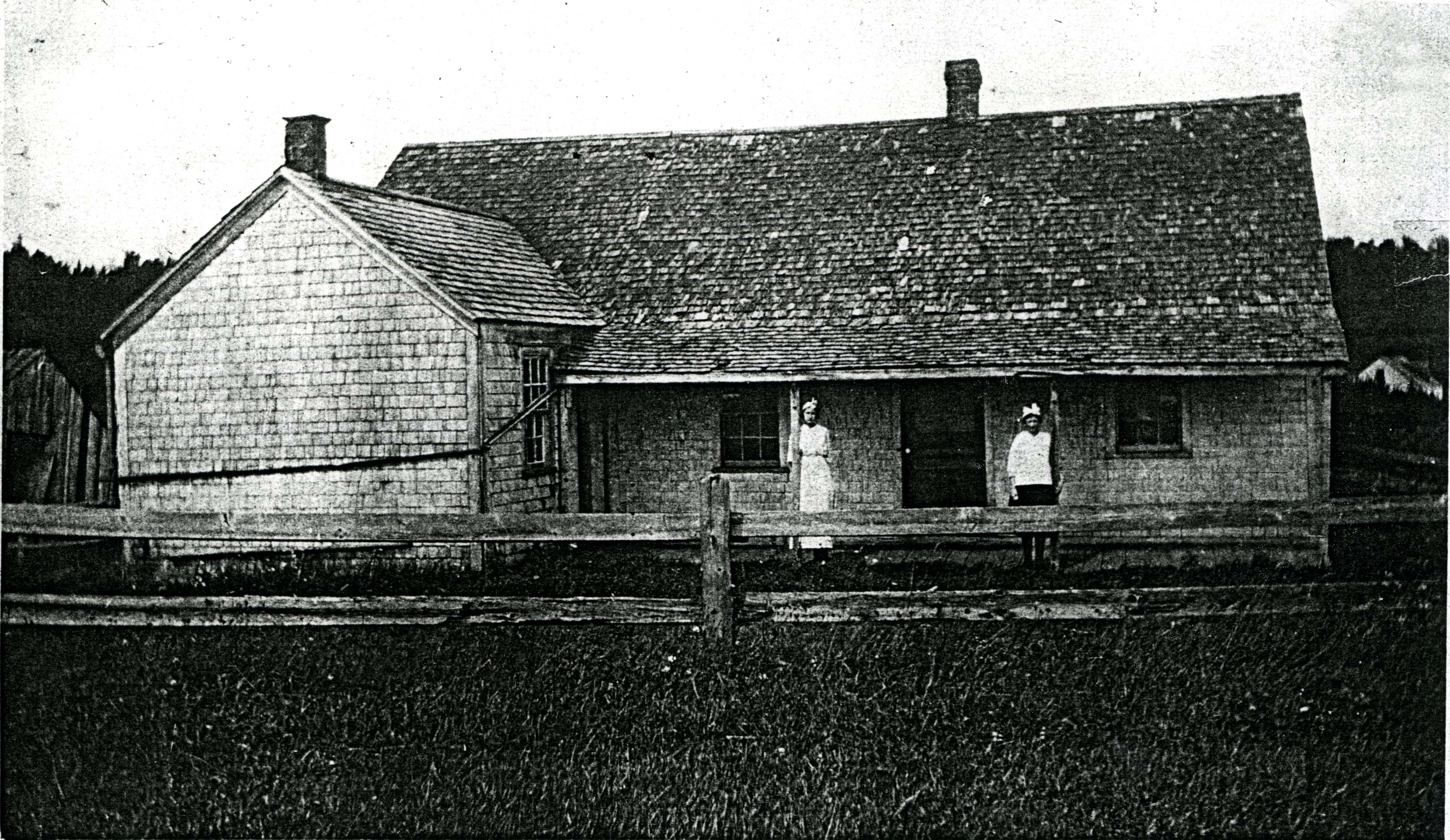 The home of Samuel Brown and Nany Marshall, Green Hill, Pictou County, Nova Scotia. Circa 1870, The two young ladies standing by the porch posts are probably Catherine Brown (Mrs. John A. Grant) and her sister Margaret Brown (Mrs. Daniel Noble).