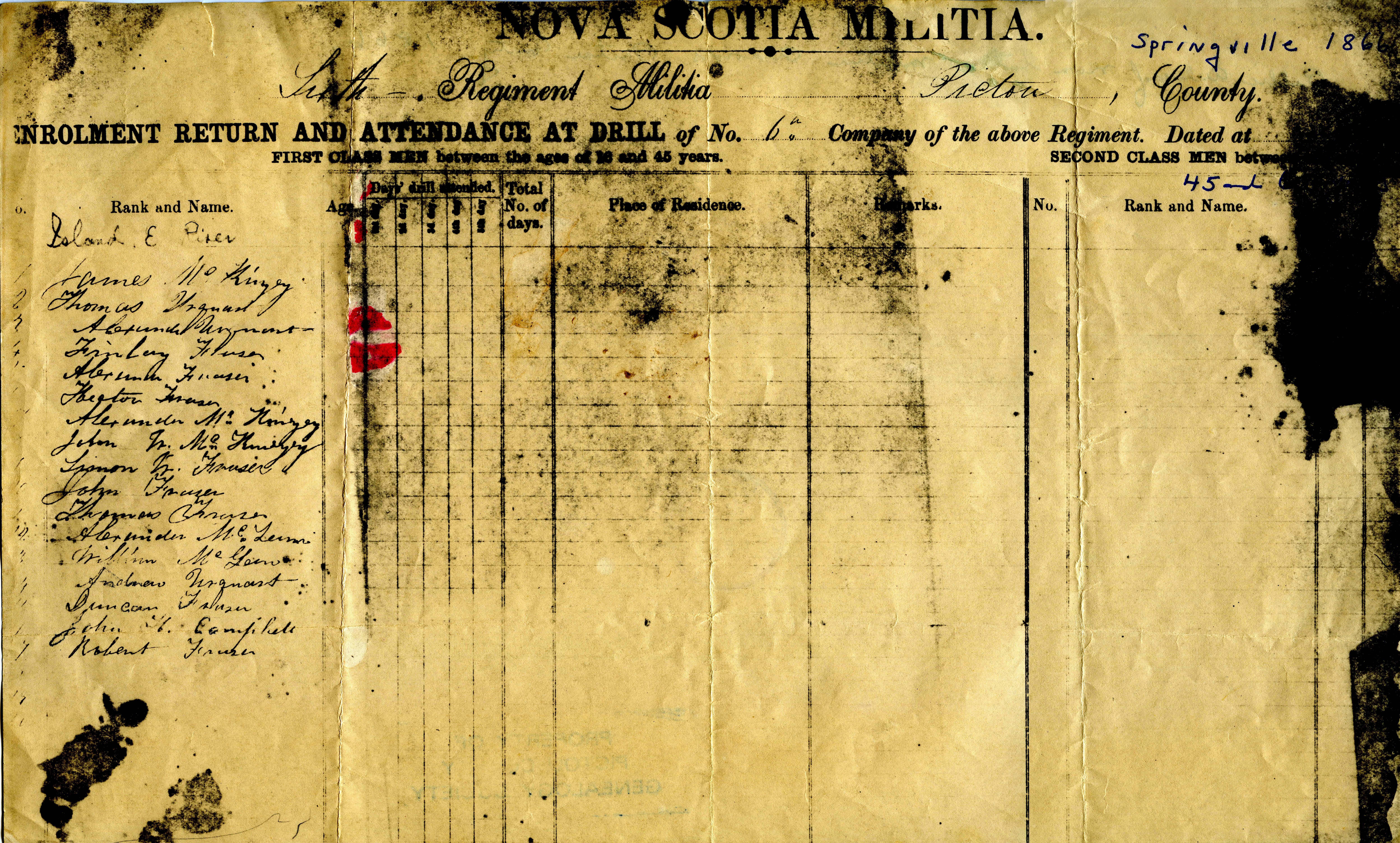 | Tags: | Militia, Military, James McKenzie, Alexander McKenzie, John W McKenzie, 6th Regiment, Springville District, John Grant, militia regiment, Pictou Militia, 1866, 1862, Thomas Urquhart, Alexander Urquhart, Finlay Fraser, Alexander Fraser, Hector Fraser, Simon W. Fraser, John Fraser, Thomas Fraser, Alexander McLean, William McLean, Andrew Urquhart, Duncan Fraser, John H. Campbell, Robert Fraser, copy, Island E. River, Island East River |