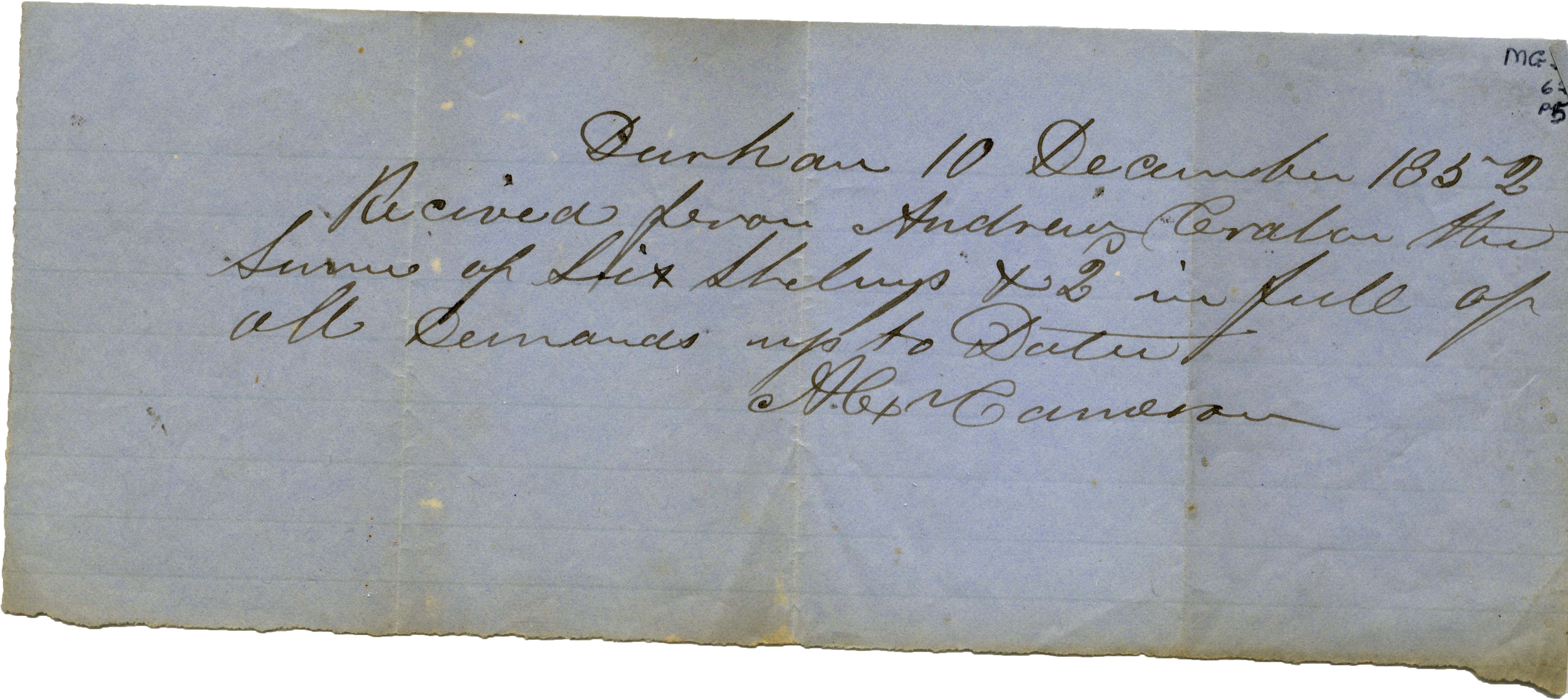 Received from Andrew Cratan the Sum of Six Shillings & 2 in full of all demands up to Date