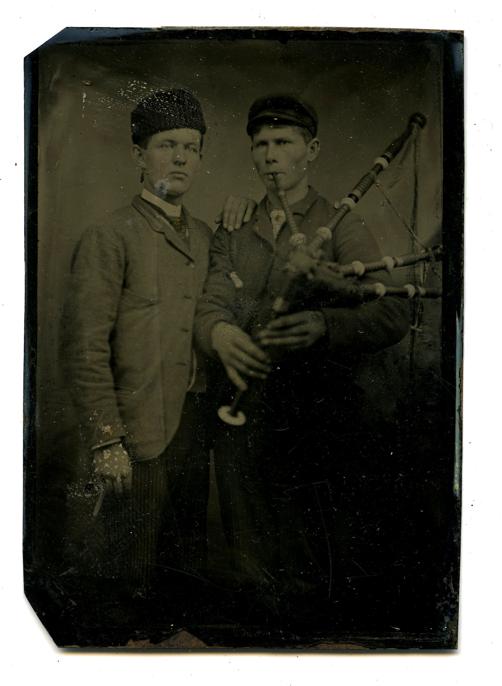 Tintype photo of two men, one playing the bagpipes, possibly taken about 1860 or 1870. It is from an album connected to the Alexander and Marion Bell Sutherland family of West Branch, River John.
