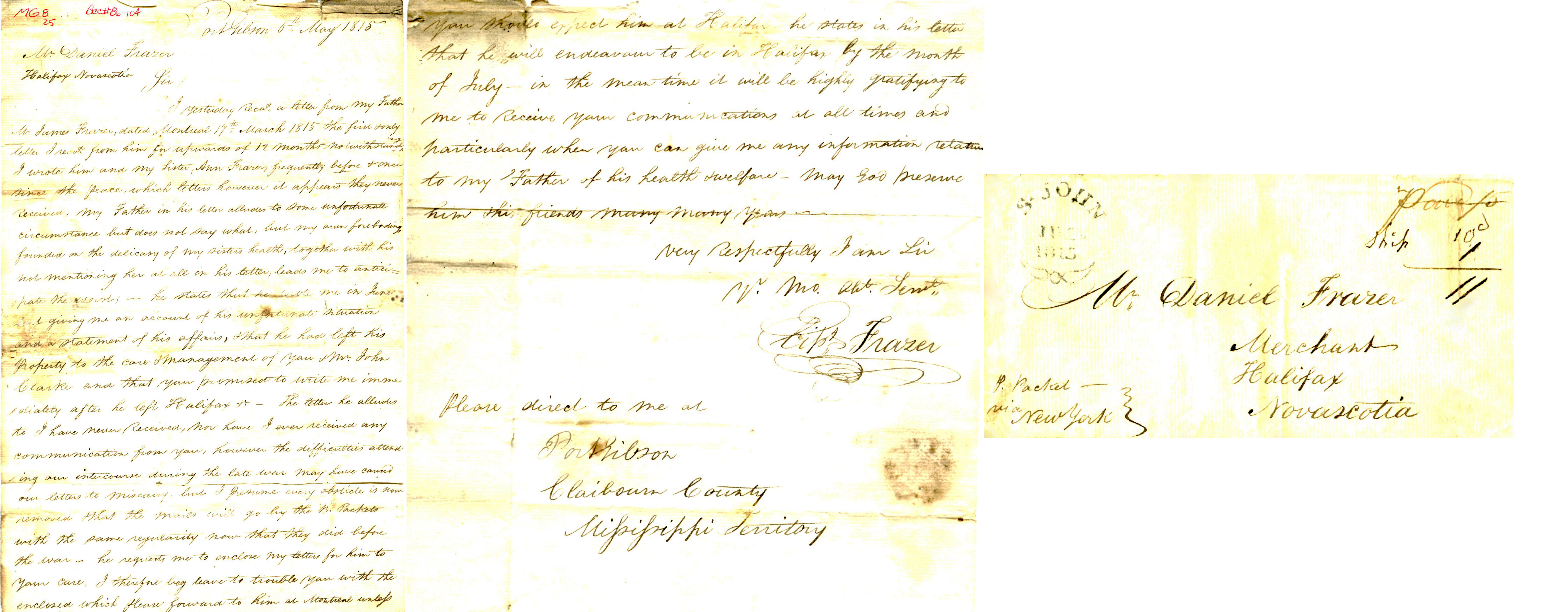 Letter to Mr Daniel Fraser, Merchant, Halifax Nova Scotia From Ms Fraser, Port Gibson, Mississippi 6 May 1815 Postmarked St. John, June 21, 1815