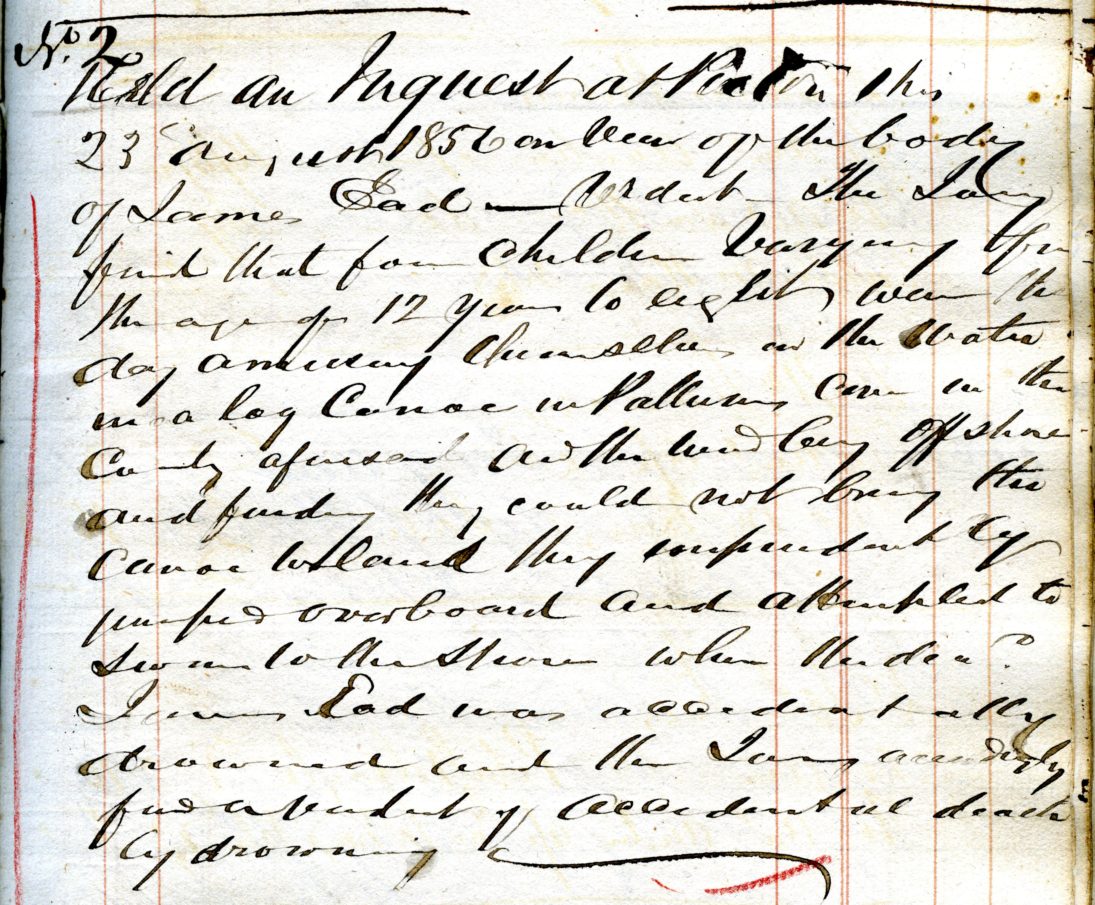 No. 2 Held an Inquest at Pictou this 23 August 1856 on view of the body of James Ead — Verdict — The Query find that four children varing from the age of 12 years to eighteen were the day amusing themselves in the water in a log canoe in Palluns cove in the County aforesaid and the wind being offshore and f-- the could not bring the canoe to land they imprudently jumped overboard and attempted to swim to the shore when the deceased James Ead was accidentally drowned and the Jury accordingly found a verdict of accidental death by drowning.