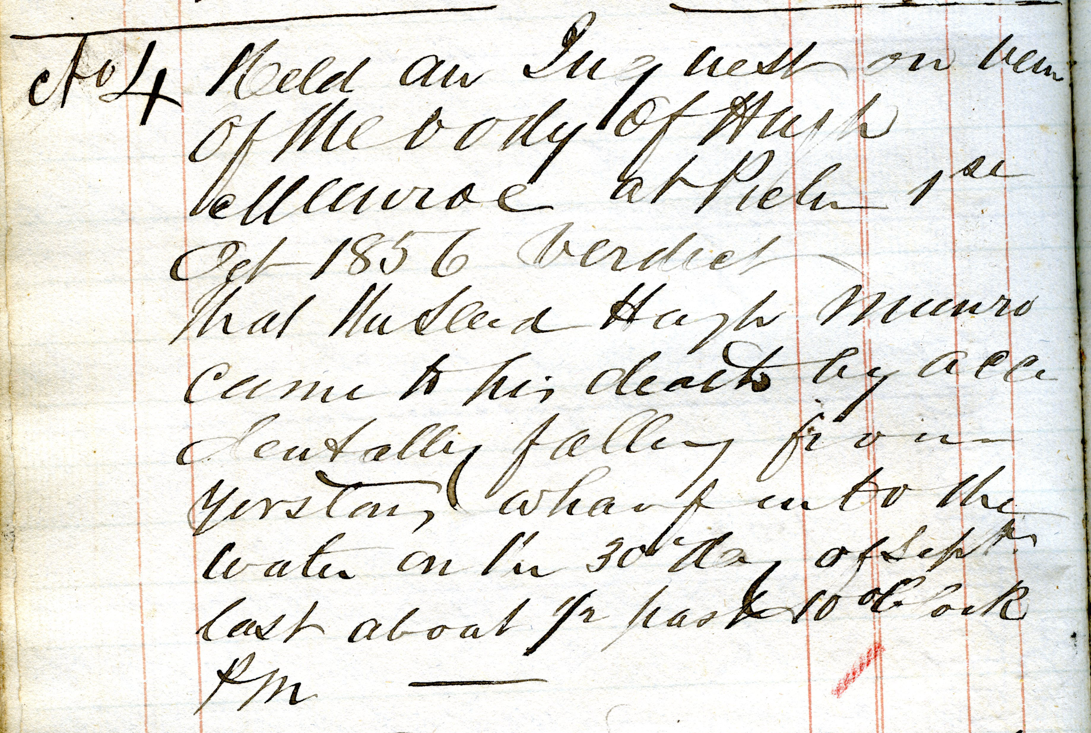 No. 4 Held an Inquest on view of the body of Hugh Munroe at Pictou 1st Oct 1856 - Verdict - That the said Hugh Munro came to his death by accidentally falling from Yorston Wharf unto the water on the 30th day of Sept last aboat 1/2 past 10 o'clock pm.