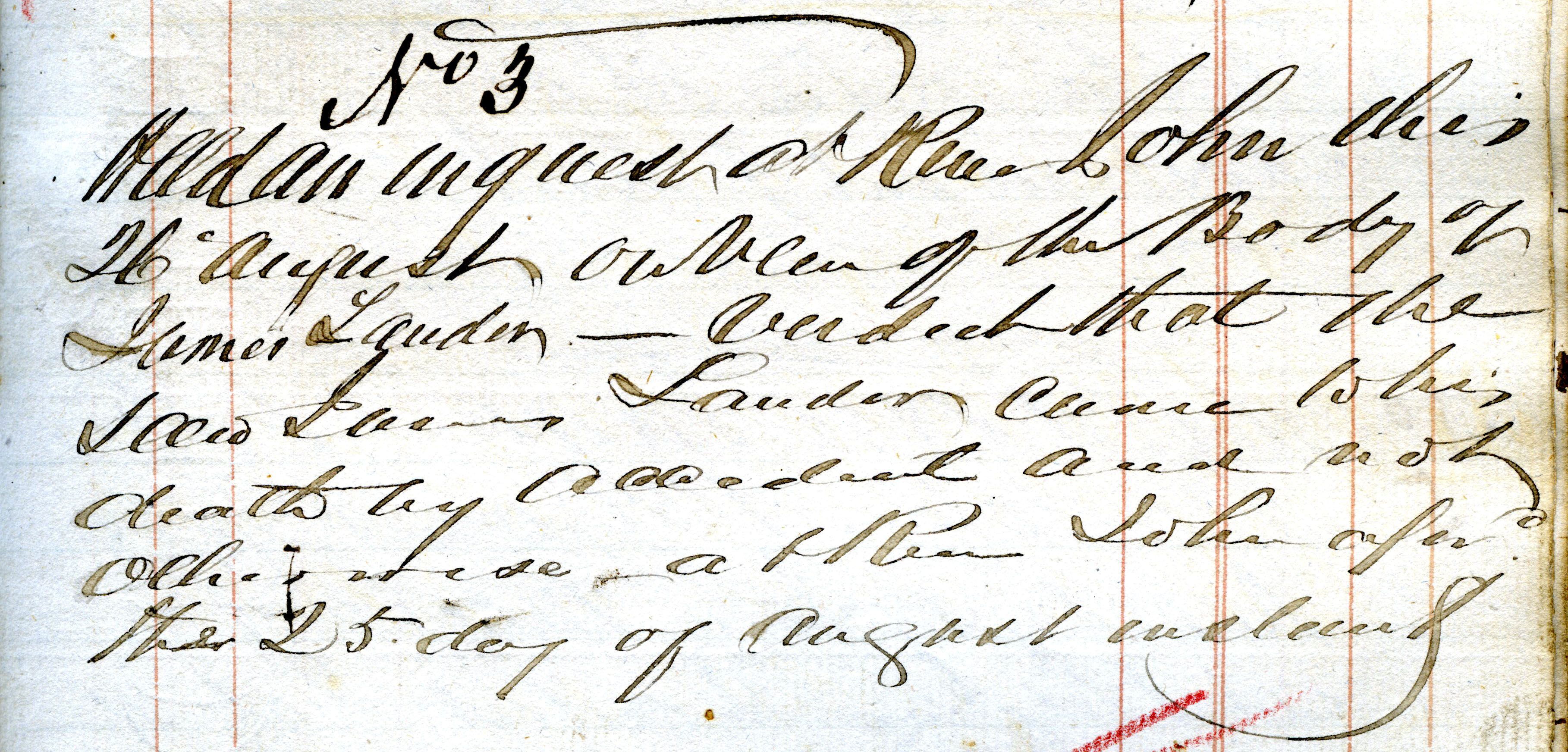 No. 3 Held and inquest at River John this 26th August on view of the body of James Lauden — Verdict that the said James Lauden came to his death by accident and not otherswise at River John --- the 25th day of August instant