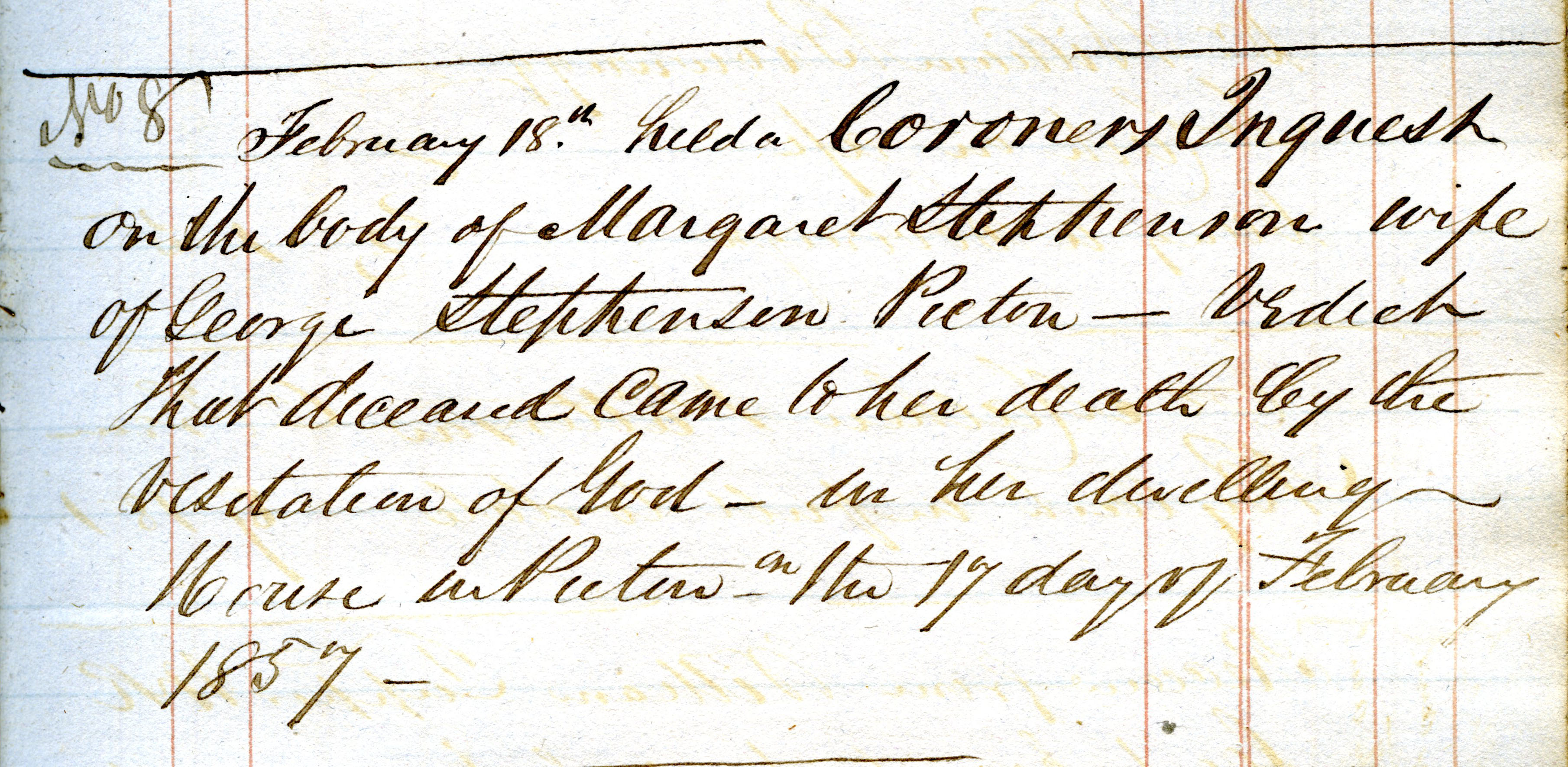 No. 8 February 18th held a Coroners Inquest on the body of Margaret Stephensen wife of George Stephensen Pictou — Verdict that deceased came to her death by the visitation of God in her dwelling House in Pictou on the 17 day of February 1857