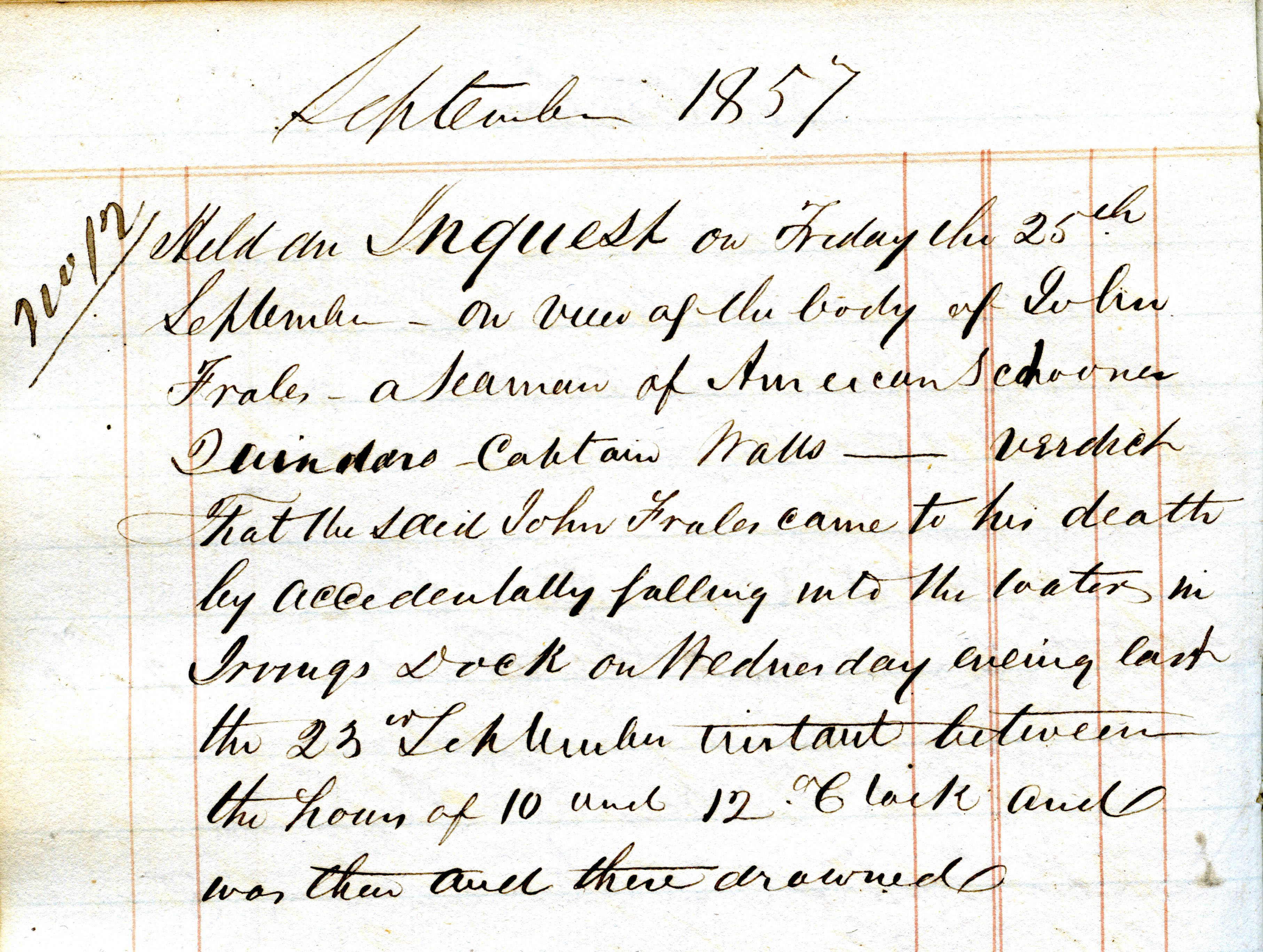 No. 12 Held an Inquest on Friday the 25th September on view of the body of John Frale, a seaman of American schooner Quindar Captain Walls — Verdict That the said John Frale came to his death by accidentally falling into the water in Irvings Dock on Wednesday evening last the 23rd September instant between the hours of 10 and 12 o'clock and was then and there drowned.
