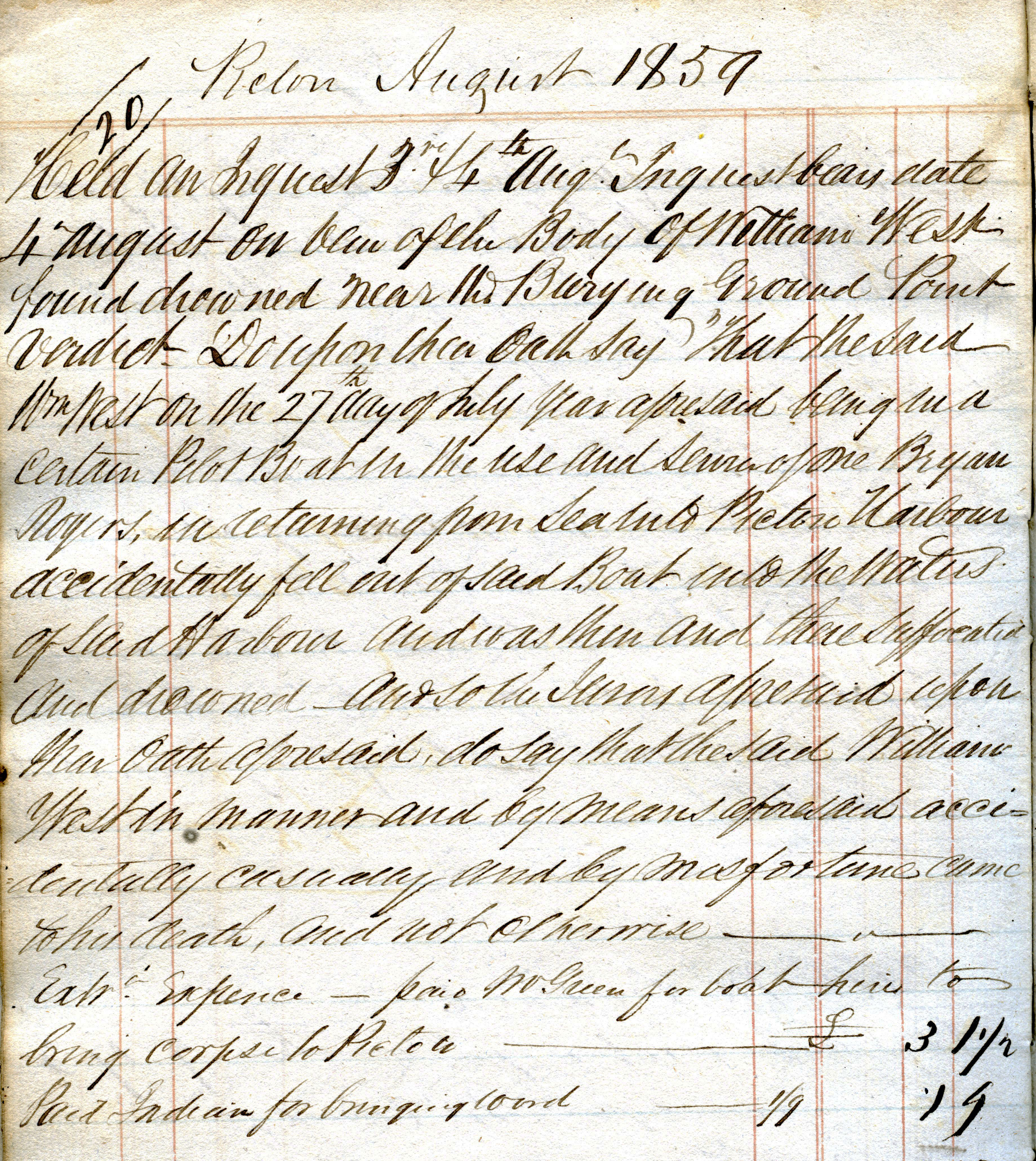 No. 20 Held an inquest 3rd & 4th August - Inquest bears date 4th August on view of the body of William West found drowned near the Burying Ground Point — Verdict (Do upon their oath say) That the said Wm West on the 27th day of July year aforesaid being in a certain Pilot Boat in the use and service of one Bryan Rogers, in returning from sea into Pictou Harbour accidentally fell out of said boat into the waters of said Harbour and was then and there suffocated and drowned and so the Jurors aforesaid upon their oath aforesaid do say that the said William West in manner and by means aforesaid accidentally casually and by misfortune came to his death, and not otherwise