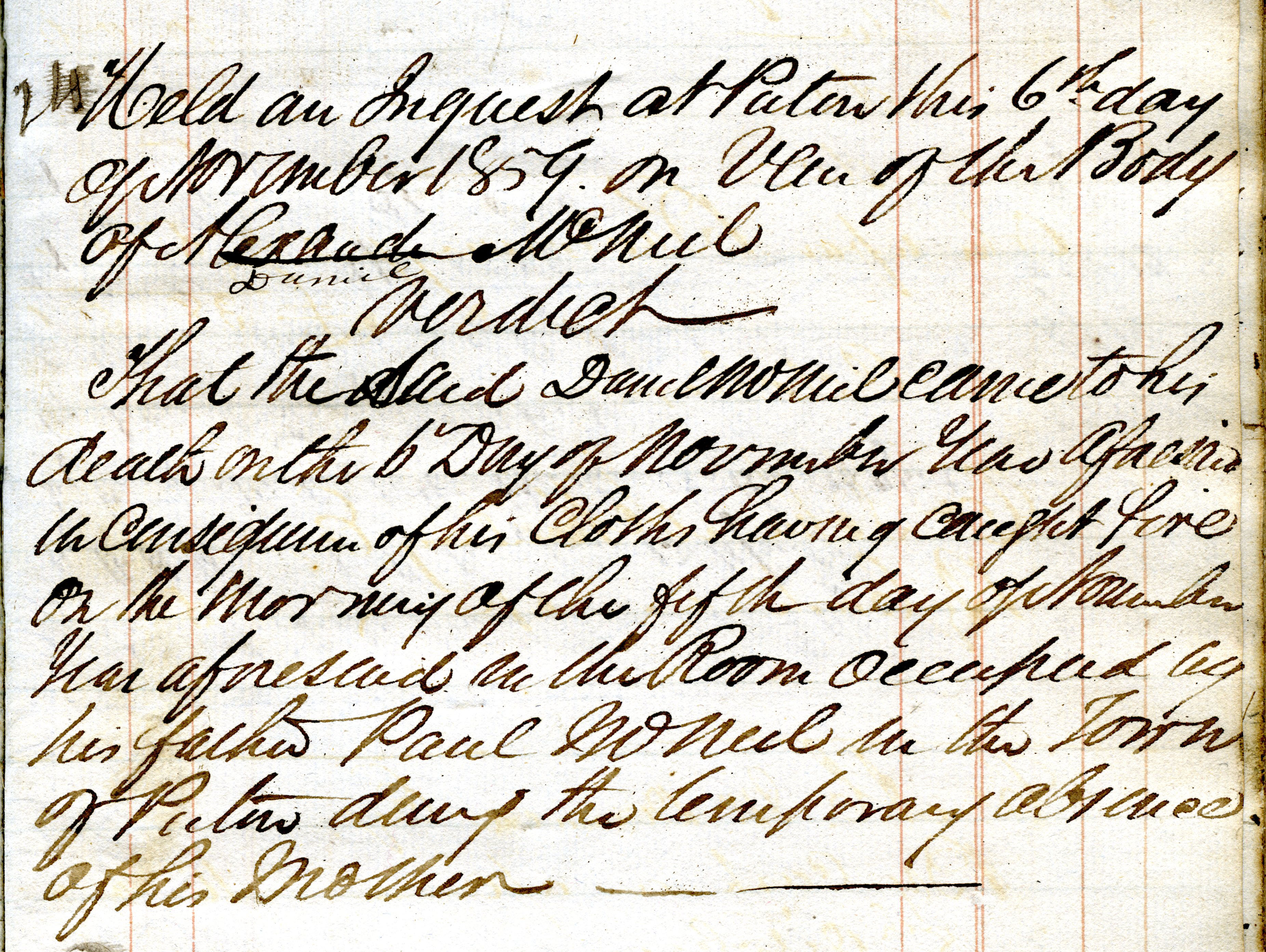 That the said Daniel McNeil came to his death on the 6 day of November year aforesaid in consequence of his clothes having caught fire on the morning of the fifth day of November year aforesaid in the room occupied by his father Paul McNeil in the town of Pictou during the temporary absence of his mother