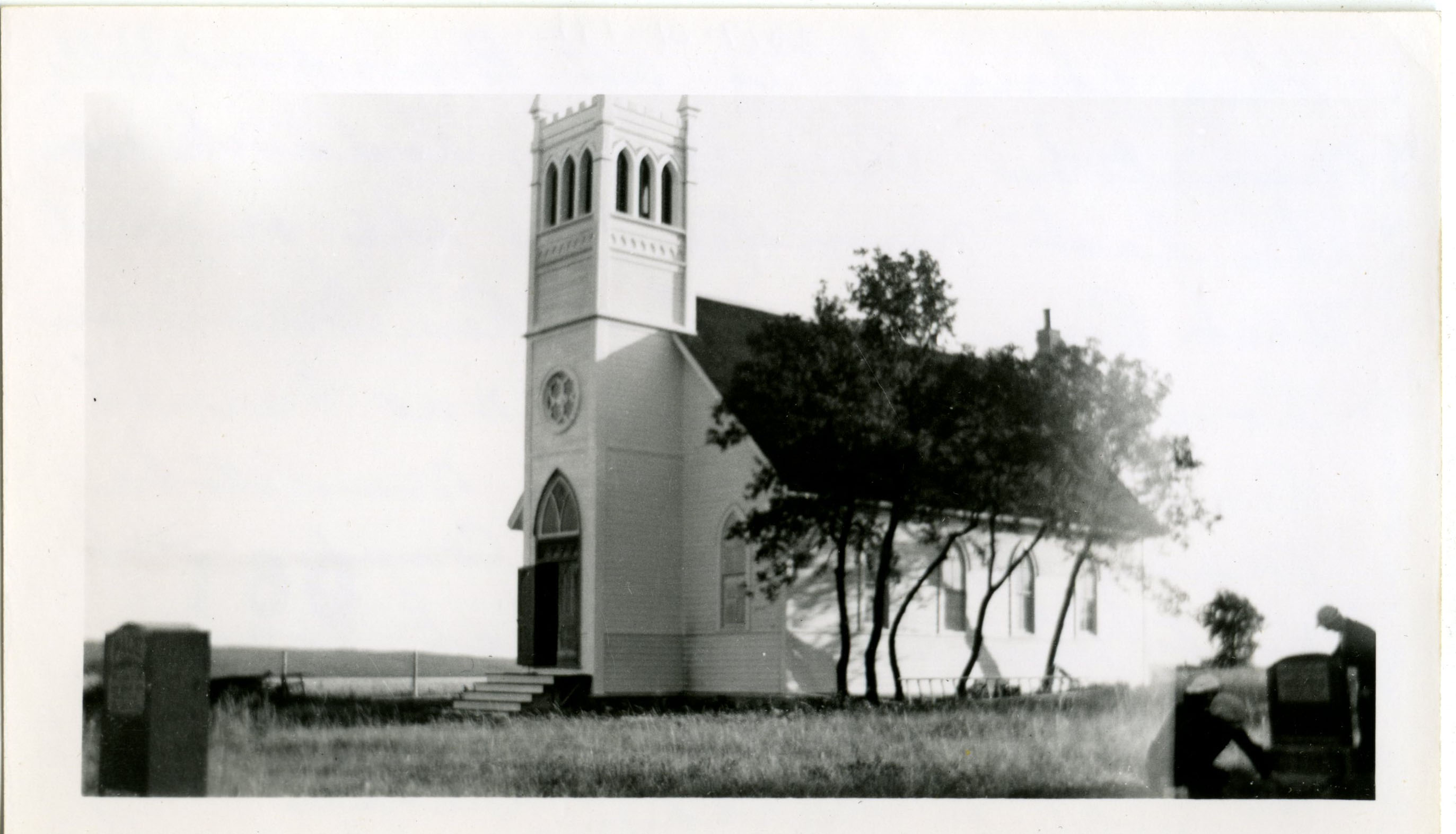 Written on back of photo - This church is at Brandon Hills, Manitoba. Rev. George Roddick was the last minister in the original West River Church of Rev. Duncan Ross's day. When it was burnt Rev. Roddick went to Manitoba. Many from Pictou County went with him. This church was build modelled after the old church in Durham. People who remember this old church say this one is exactly like it.
