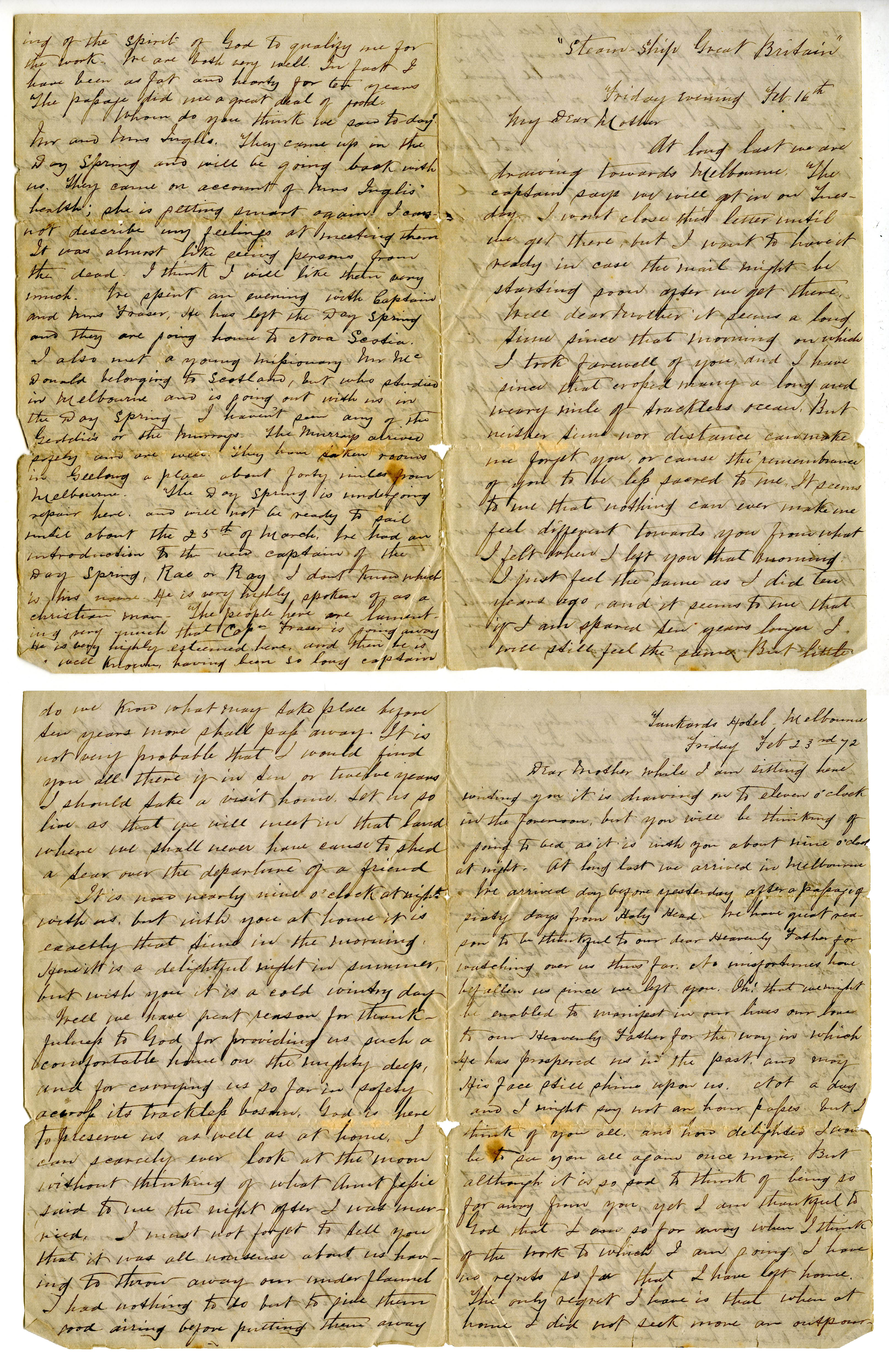 I've arrived day before yesterday after a passage of windy days from Holy Head. We have great reason to be thankful to our dear Heavenly Father for watching over us this far. No misfortunes have befallen us since we left you. Oh! that we might be enabled to manifest in our lives our love to our Heavenly Father for the way in which He has prospered un is the past and may His face still shine upon us. Not a day and I might say not an hour passes but I think of you all and how delighted I would be to see you all again once more. But although it is so sad to think of being so far away from you, yet I am thankful to God that I am so far away when I think of the work to which I am going. I have no regrets so far that I have left home. The only regret I have is that when at home I did not seek more an outpour
