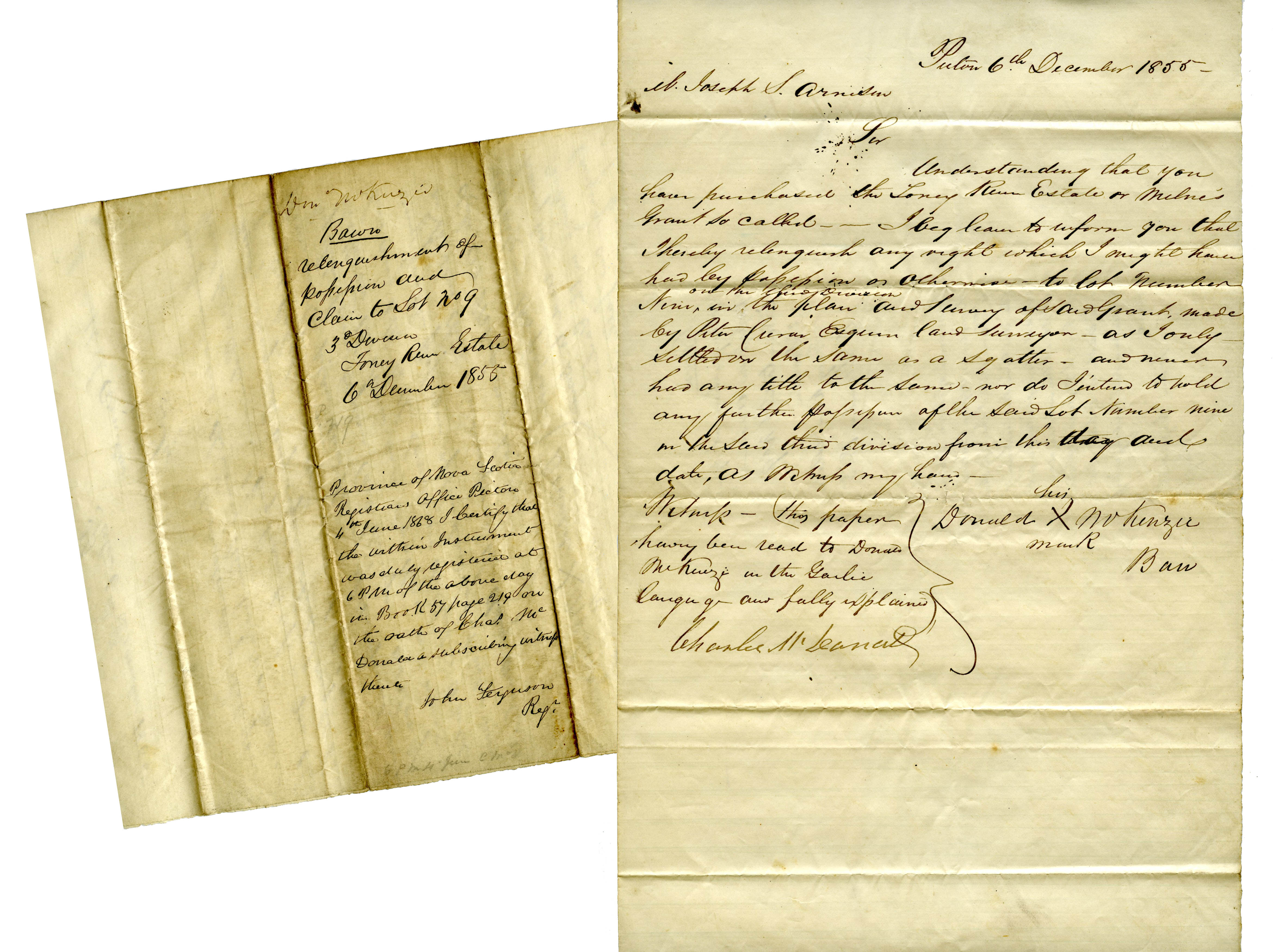 Understanding that you have purchased the Toney River Estate or Milne's Grant so called — I beg leave to inform you that I hereby relinquish any right which I might have had by possession or otherwise — to lot number nine on the third Division in the plan and survey of said Grant, made by Peter Crerar Esquire land surveyor — as I only settled on the same as a squatter — and never had any title to the same, nor do I intend to hold any further possession of the said Lot Number nine in the said third division from this day and date, as witness my hand — Donald M'Kenzie, Ban, X his mark