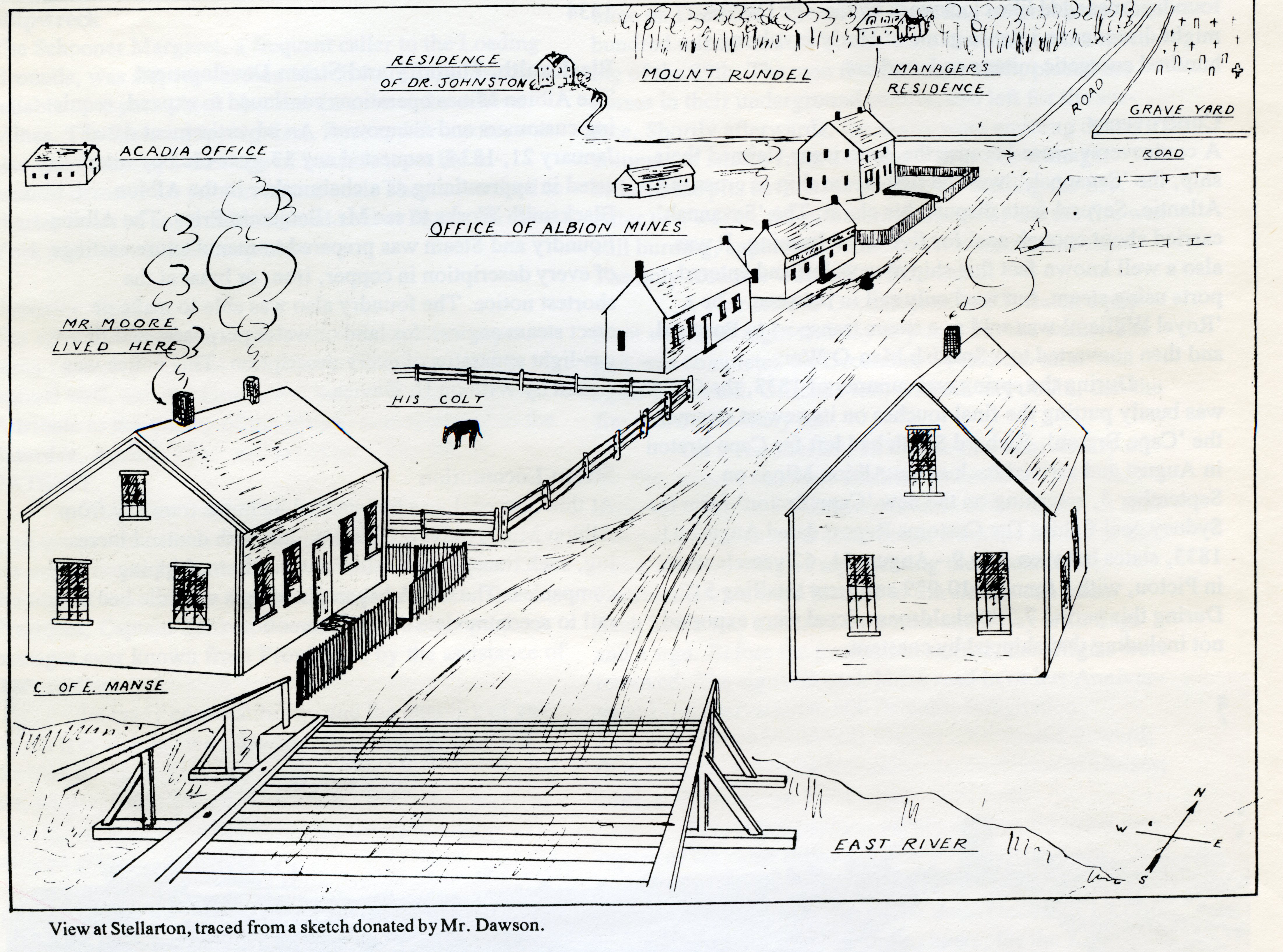 "View at Stellarton, traced from a sketch donated by Mr. Dawson." From A Centennial History of Stellarton by M. Stephen Kirincich, and illustrates the early days of Albion Mines (what became Stellarton), including the Mount Rundel residence of Richard Smith.
