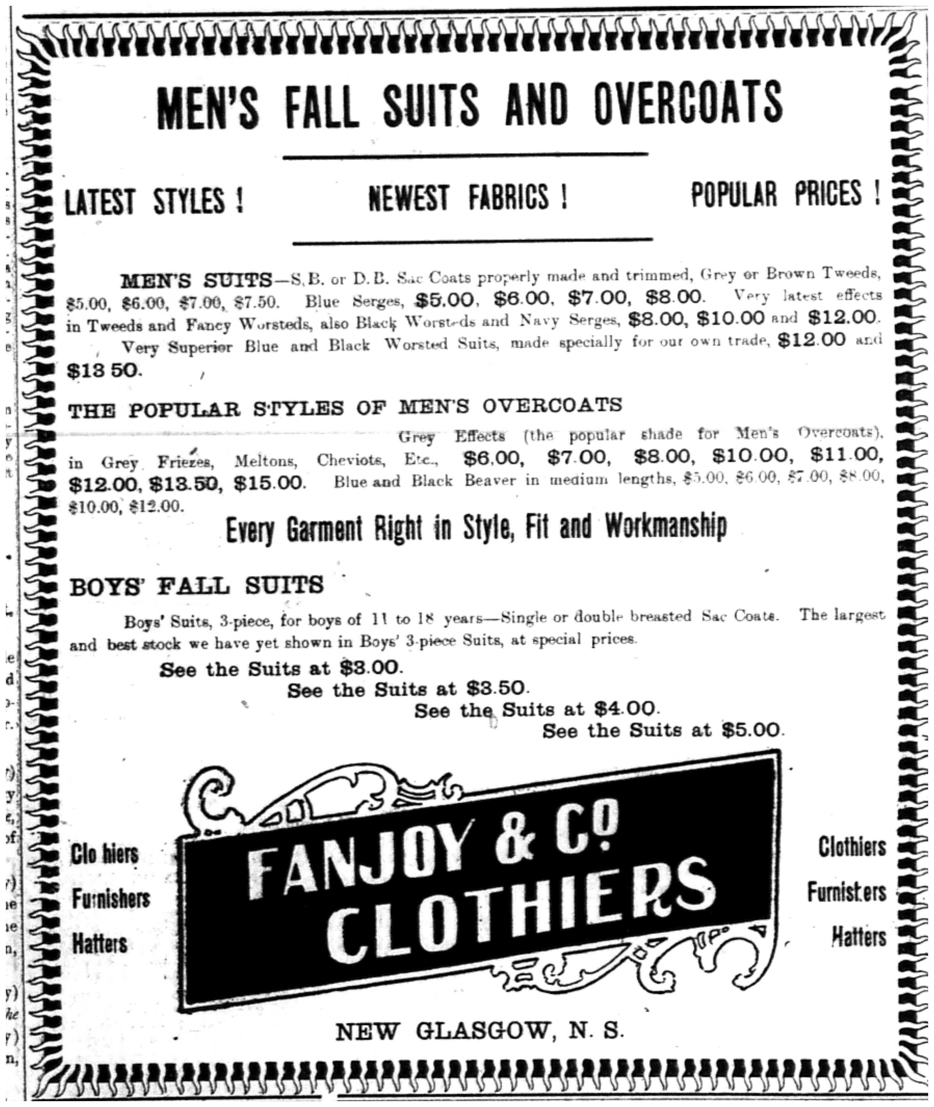 Advertisement for Men's suits and overcoats, and boys' suits at Fanjoy & Co. Clothiers in New Glasgow, from the Oct. 2, 1902 edition of the Eastern Chronicle