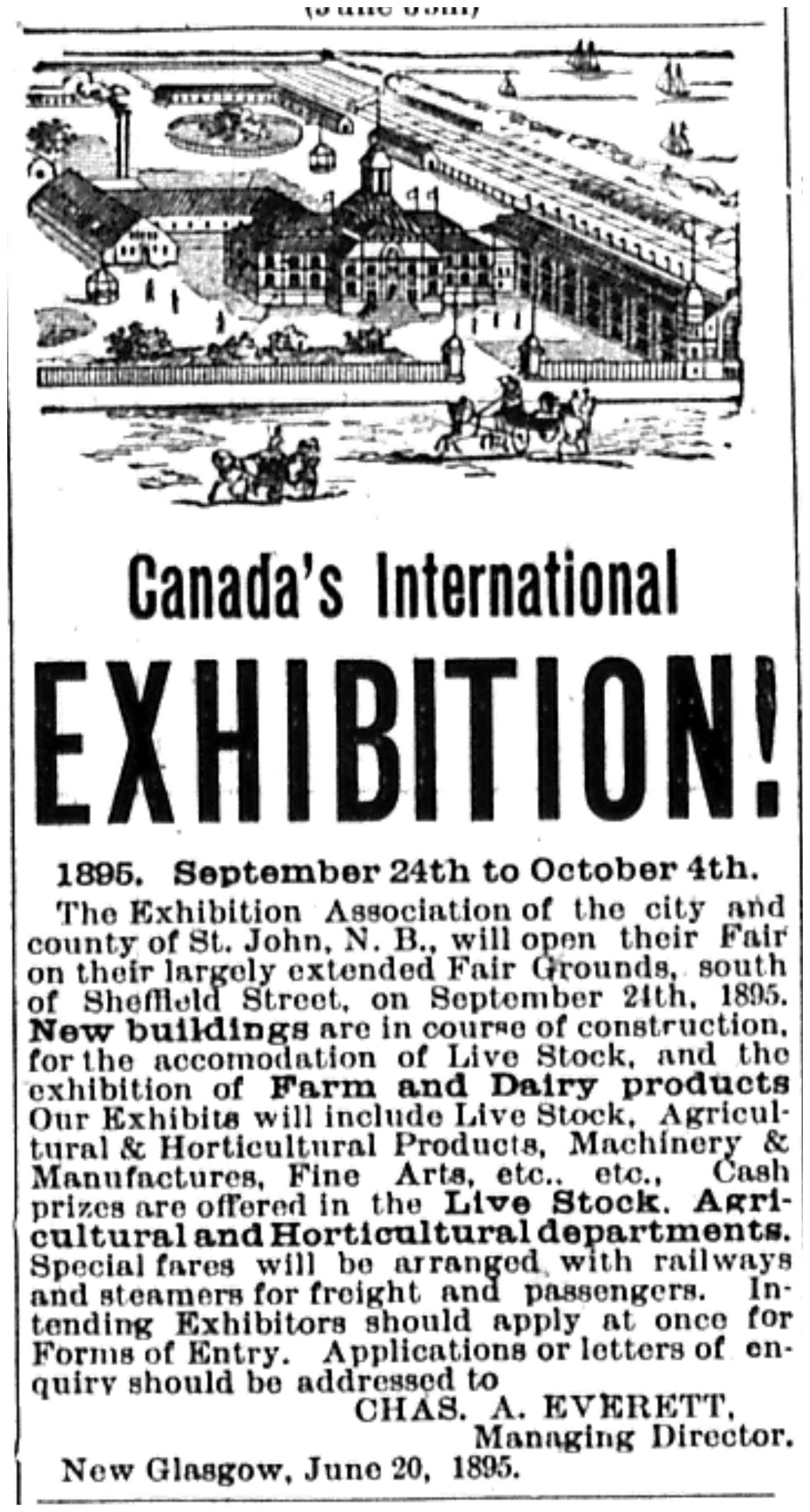 Advertisement for Canada's International Exhibition, from the Sept. 12, 1895 issue of the Eastern Chronicle. The exhibition was held in Saint John, with special trains running to bring in visitors from across the Maritimes.