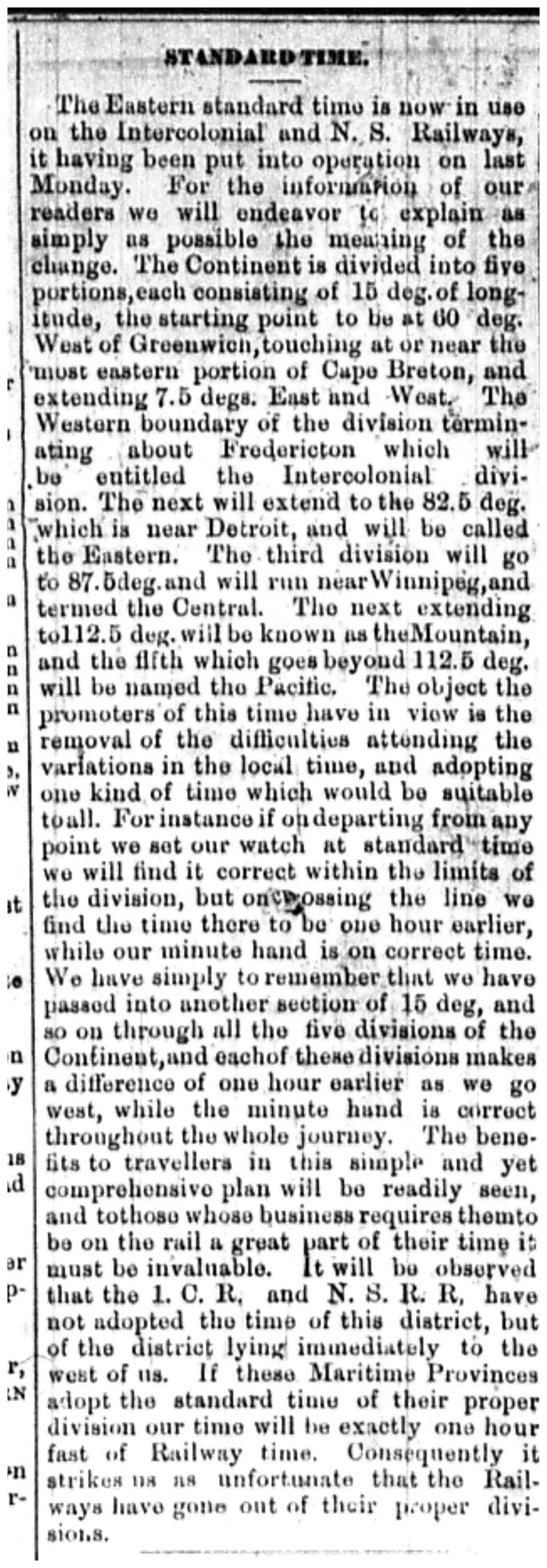 The Eastern standard time is now in use on the Intercolonial and N.S. Railways, it having been put into operation on last Monday. For the information of our readers we will endeavor to explain as simple as possible the meaning of the change. The Continent is divided into five portions, each consisting of 15 deg. of longitude, the starting point to be at 60 deg. West of Greenwich, touching at or near the most eastern portion of Cape Breton, and extending 7.5 degs. East and West. The Western boundary of the division terminating about Fredericton which will be entitled the Intercolonial division. The next will extend to the 82.5 deg. which is near Detroit, and will be called the Eastern. The third division will go to 87.5 deg. and will run near Winnipeg, and termed the Central. The next extending to 112.5 deg. will be known as the Mountain, and the fifth which goes beyond 112.5 deg. will be named the Pacific. The object the promoters of this time have in view is the removal of the difficulties attending the variations in the local time, and adopting one kind of time which would be suitable to all. For instance if on departing from any point we set our watch at standard time we will find it correct within the limits of the division, but on crossing the line we find the time there to be one hour earlier, while our minute hand is on correct time. We have simply to remember that we have passed into another section of 15 deg., and so on through all the five divisions of the Continent, and each of these divisions makes a difference of one house earlier as we go west, while the minute hand is correct throughout the whole journey. The benefits to travellers in this simple and yet comprehensive plan will be readily seen, and to those who business requires them to be on the rail a great part of their time it must be invaluable. It will be observed that the I.C.R. and N.S.R.R. have not adopted the time of this district, but of the district ling immediately to the west of us. If these Maritime Provinces adopt the standard time of their proper division our time will be exactly one house fast of Railway time. Consequently it strikes us as unfortunate that the Railways have gone out of their proper divisions."