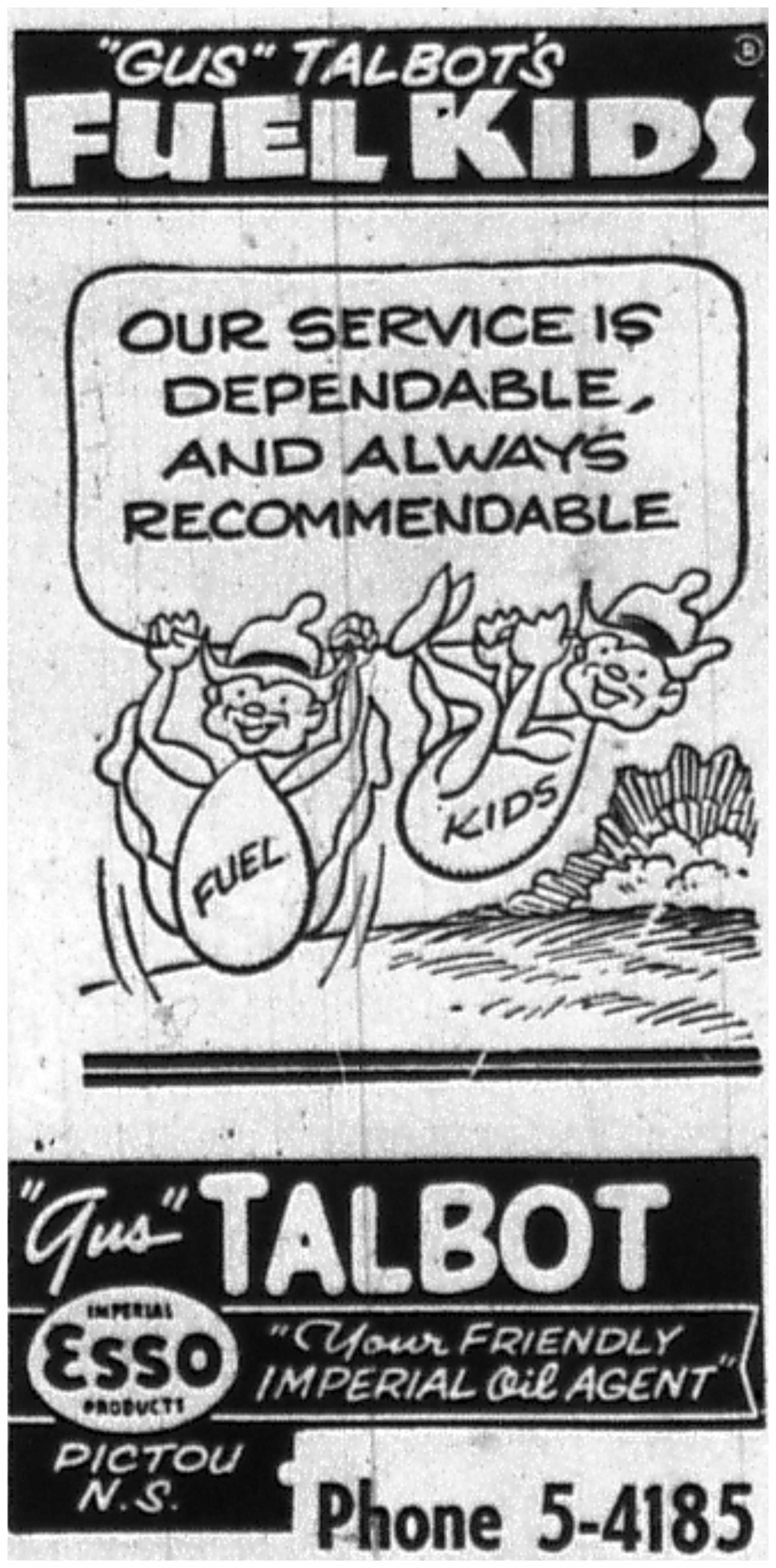 Advertisement from the May 21, 1959 edition of the Pictou Advocate fro Gus Talbot's Esso station depicting the Fuel Kids.