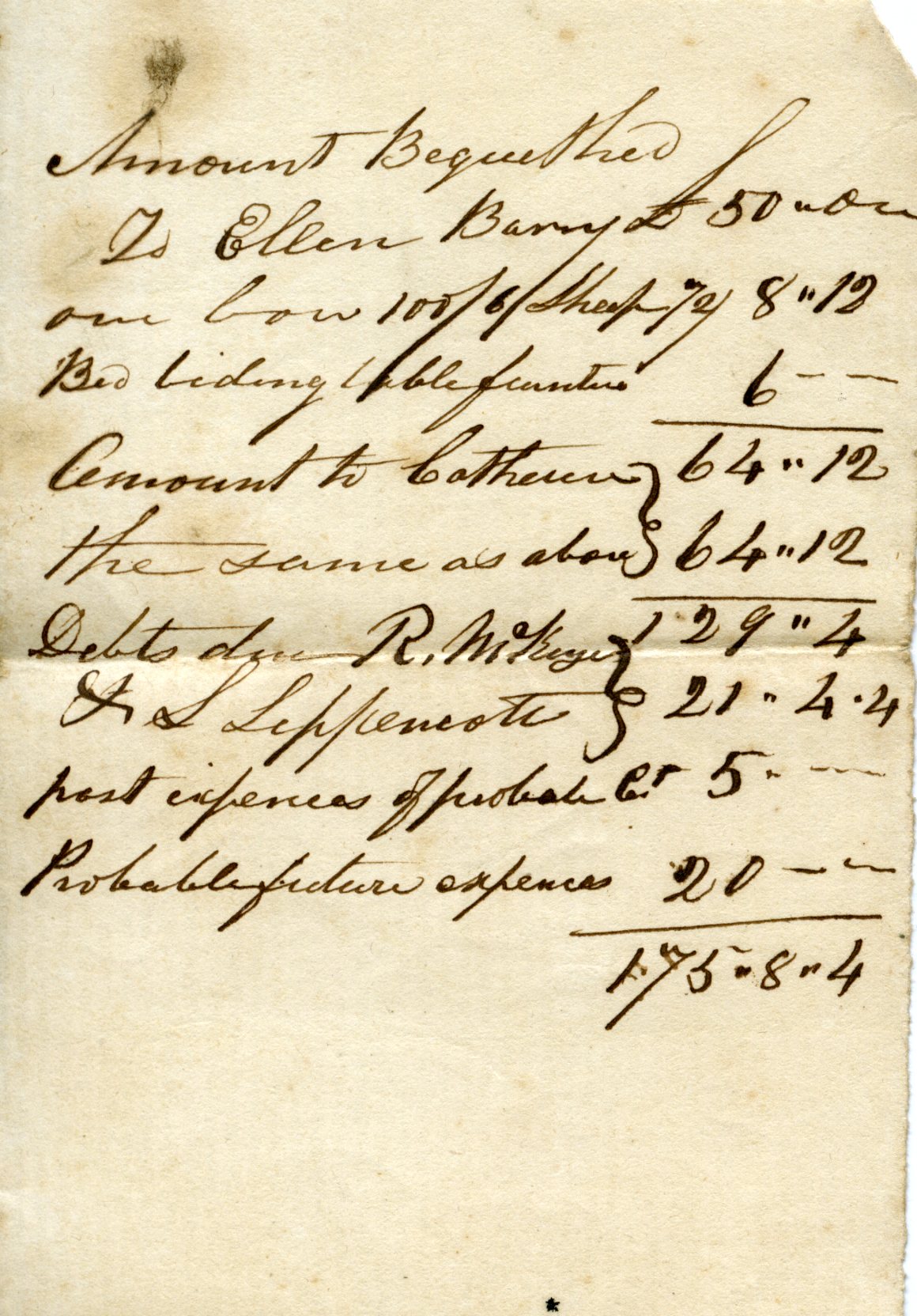 Amount of money bequeathed to various people – Ellen Barry, Catherine, R. McKay and S. Lippincott.