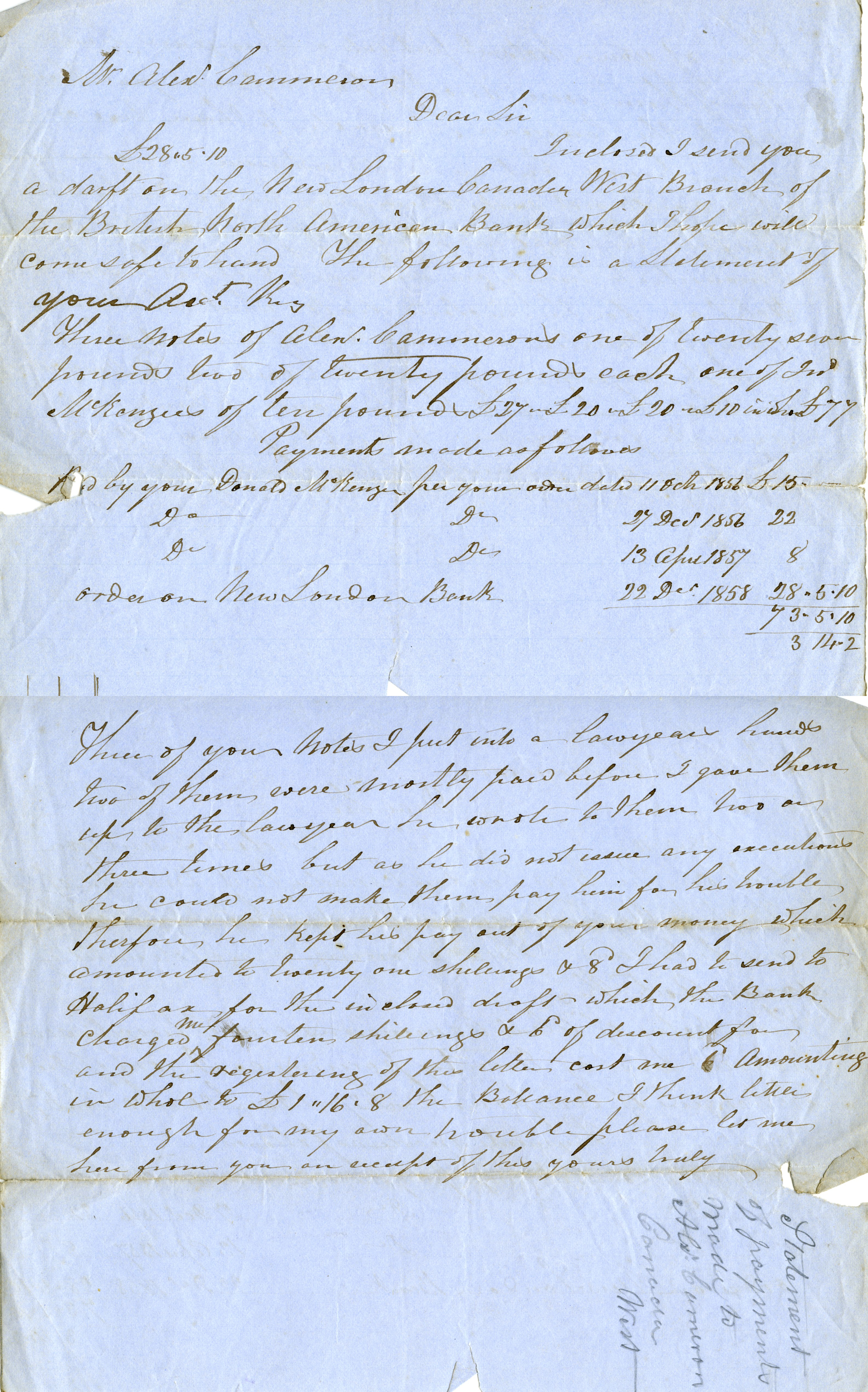£28..5..10 [Enclosed] I send you a [draft?] on the New London Canada West Branch of the British North American Bank which I hope will come safe to hand. The following is a statement of your receipt [key?]