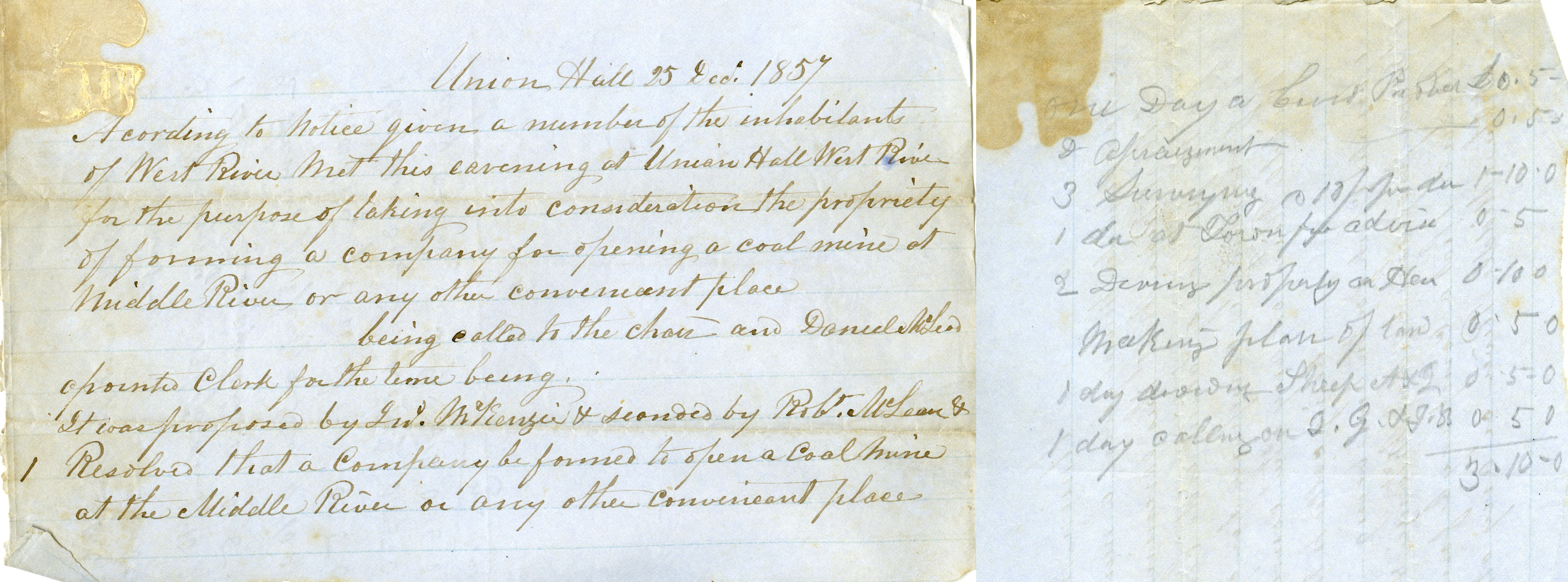 According to notice given a number of the inhabitants of West River met this evening at Union Hall West River for the purpose of taking into consideration the propriety of forming a company for opening a coal mine at Middle River or any other convenient place.