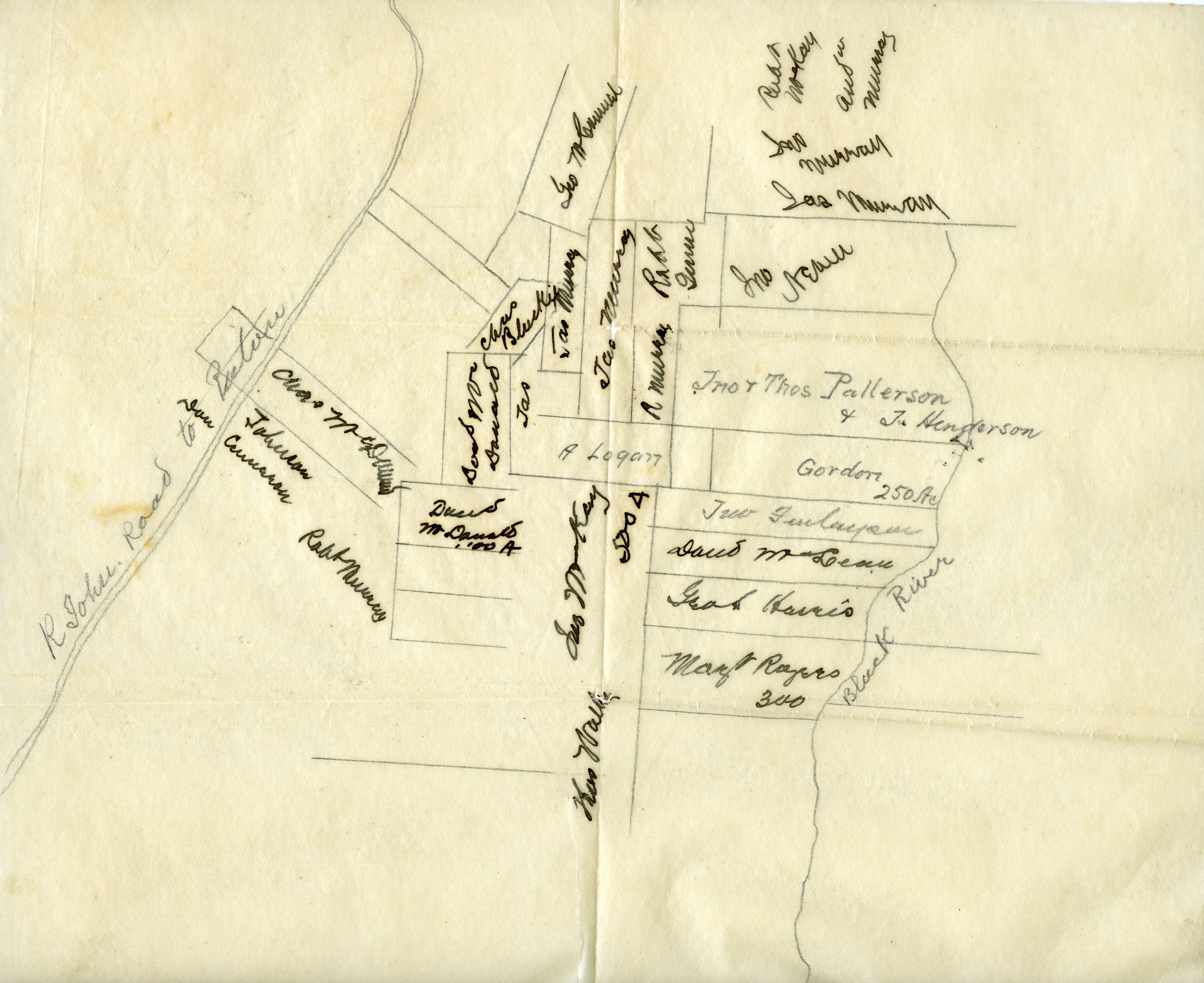 Black River and River John Road to Pictou are featured on the plan that includes the properties of Charles [McDonald?], Johnson, Daniel Cameron, Robert Murray, David McDonald, Donald McDonald, Mason [?] Blackie, James Murray, A. Logan, James McKay, Thomas [Nallie?], A. Murray, Robert Innes, Robert McKay, Andrew Murray, John [Neaill?] John and Thomas Patterson, J. Henderson, Gordon, John Finlayson, David McLean, George Harris, and Margaret Rogers.