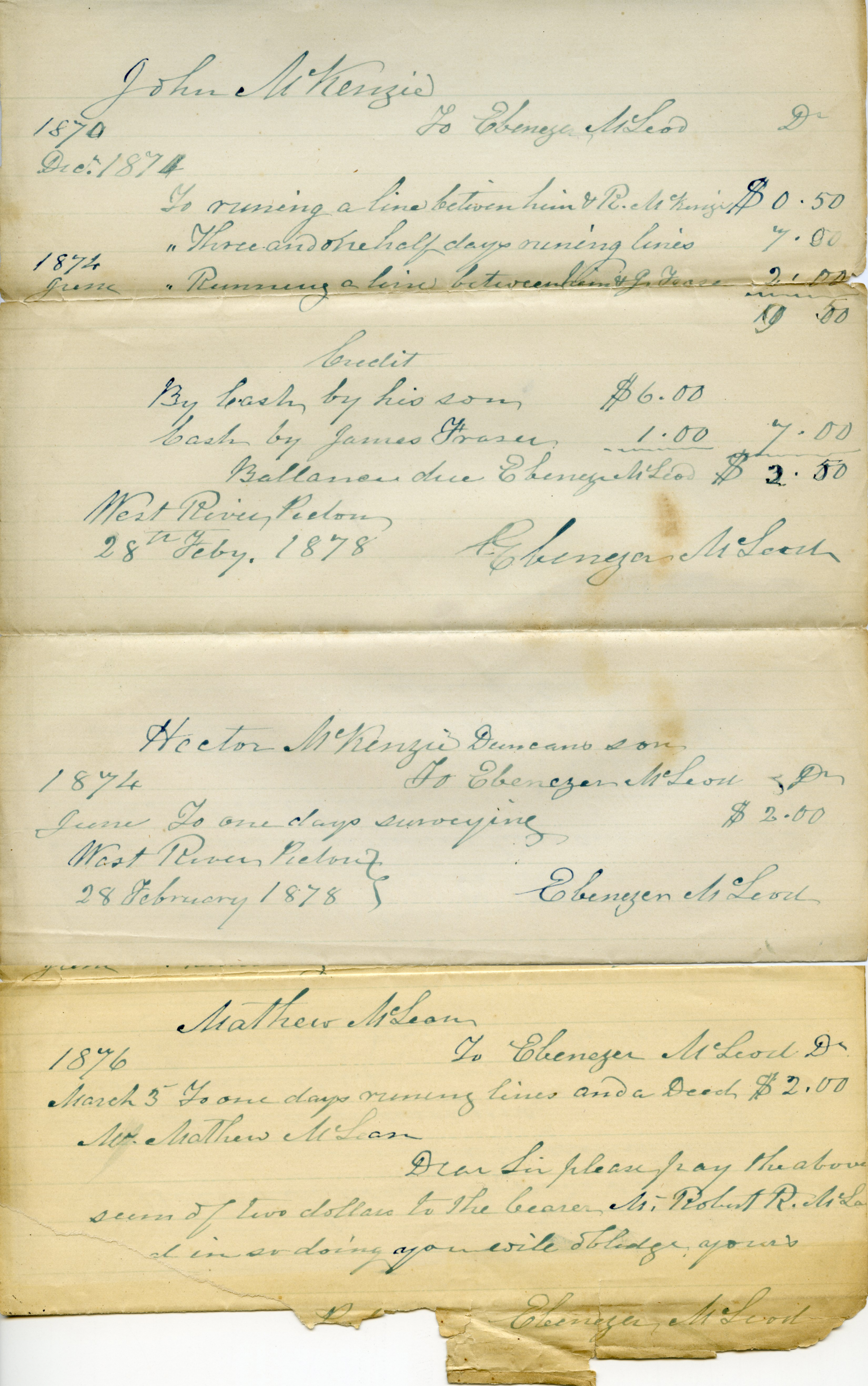 | Tags: | MacLeod Papers, MacLeod, McLeod, accounts, Ebenezer McLeod, John McKenzie, R. McKenzie, J. Lease, James Fraser, Hector McKenzie, West River, Mathew McLean |