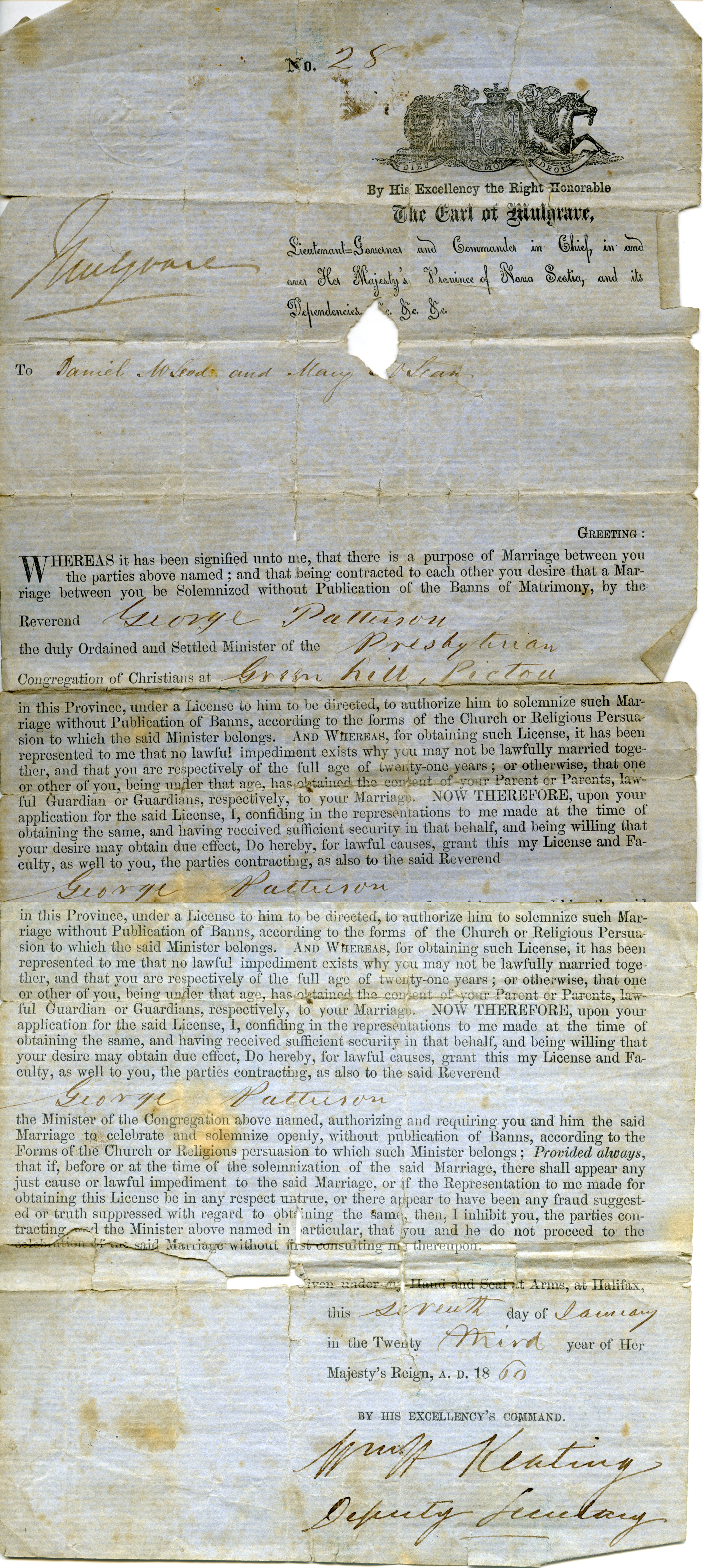 Whereas it has been signified unto me, that there is a purpose of Marriage between you the parties above named; and that being contracted to each other you desire that a Marriage between you be Solemnized without Publication of the Banns of Matrimony, but the Revered George Patterson the duly Ordained and Settled Minister of the Presbyterian Congregation of Christians at Greenhill, Pictou in this Province, under a License to him to be directed, to authorize him to solemnize such Marriage without Publication of Banns, according to the forms of the Church or Religious Persuasion to which the said Minister belongs. AND WHEREAS, for obtaining such License, it has been represented to me that no lawful impediment exists why you may not be lawfully married together, and that you are respectively of the full age of twenty-one years; or otherwise, that one or other of you, being under that age, has obtained the consent of your Parent or Parents, lawful Guardian or Guardians, respectively, to your Marriage. NOW THEREFORE, upon your application for the said License, I, confiding in the representations to me made at the time of obtaining the same, and having received sufficient security in that behalf, and being willing that your desire may obtain due effect, Do hereby, for lawful causes, grant this my License and Faculty, as well to you, the parties contracting, as also to the said Reverend George Patterson in this Province, under a License to him to be directed, to authorize him to solemnize such marriage without Publication of Banns, according to the forms of the Church or Religious Persuasion to which the said Minister belongs. AND WHEREAS, for obtaining such License, it has been represented to me that no lawful impediment exists why you may not be lawfully married together, and that you are respectively of the full age of twenty-one years; or otherwise, that one or other of you, being under that age, has obtained the consent of your Parent or Parents, lawful Guardian or Guardians, respectively, to your Marriage. NOW THEREFORE, upon your application for the said License, I, confiding in the representations to me made at the time of obtaining the same, and having received sufficient security in that behalf, and being willing that your desire may obtain due effect, Do hereby, for lawful causes, grant this my License and Faculty, as well to you, the parties contracting, as also to the said Reverend George Patterson the Minister of the Congregation above named, authorizing and requiring you and him the said Marriage to celebrate and solemnize openly, without publication of Banns, according to the Forms of the Church or Religious persuasion to which such Minister belongs; Provided always, that if, before or at the time of the solemnization of the said Marriage, there shall appear any just cause of lawful impediment to the said Marriage, or if the Representation to me made for obtaining this License be in any respect untrue, or there appear to have been any fraud suggested or truth suppressed with regard to obtaining the same, then, I inhibit you, the parties contracting and the Minister above named in particular, that you and he do not proceed to the celebration of said Marriage without first consulting me thereupon.