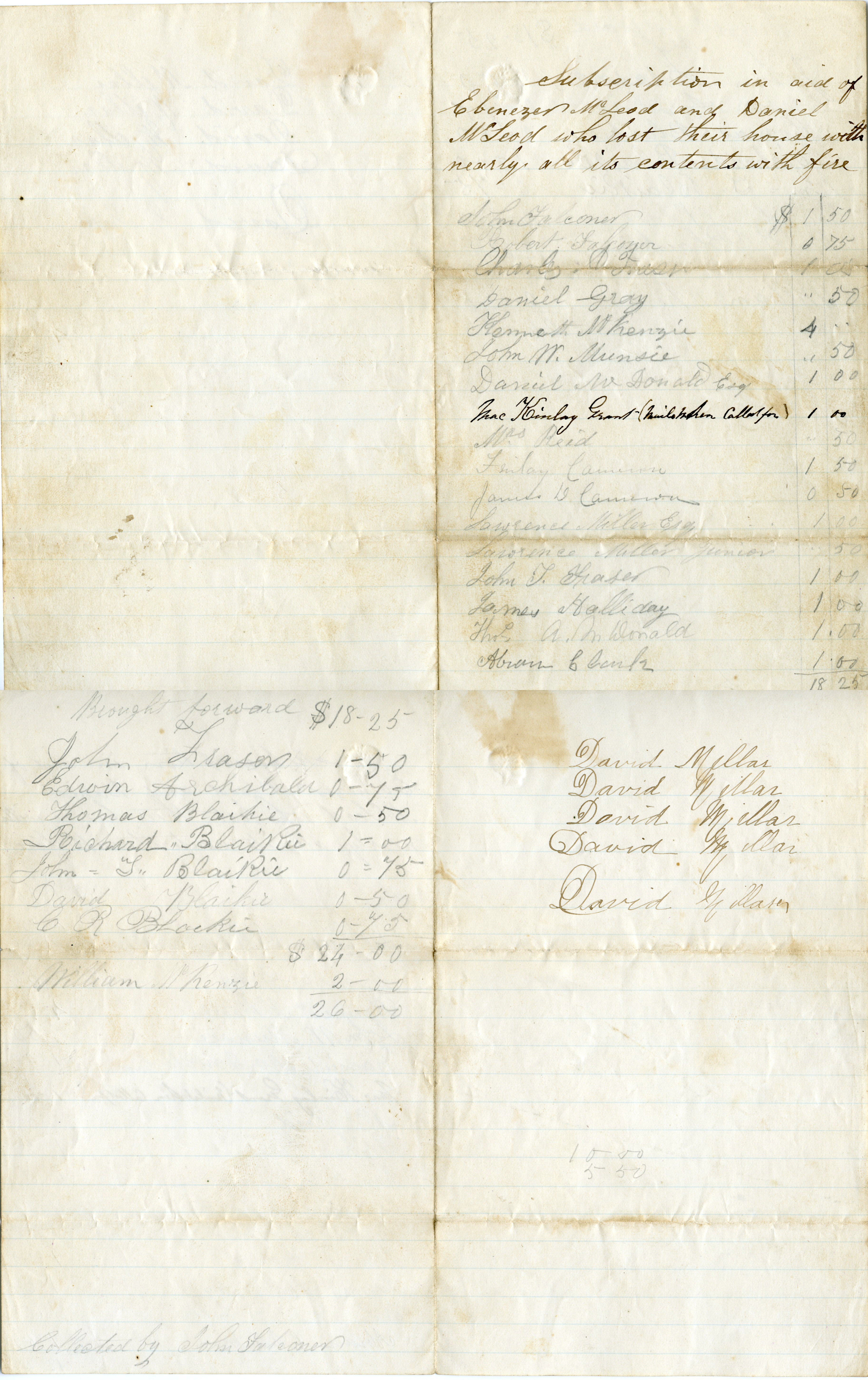 “Subscription in aid of Ebenezer McLeod and Daniel McLeod who lost their house with nearly all its contents with fire.