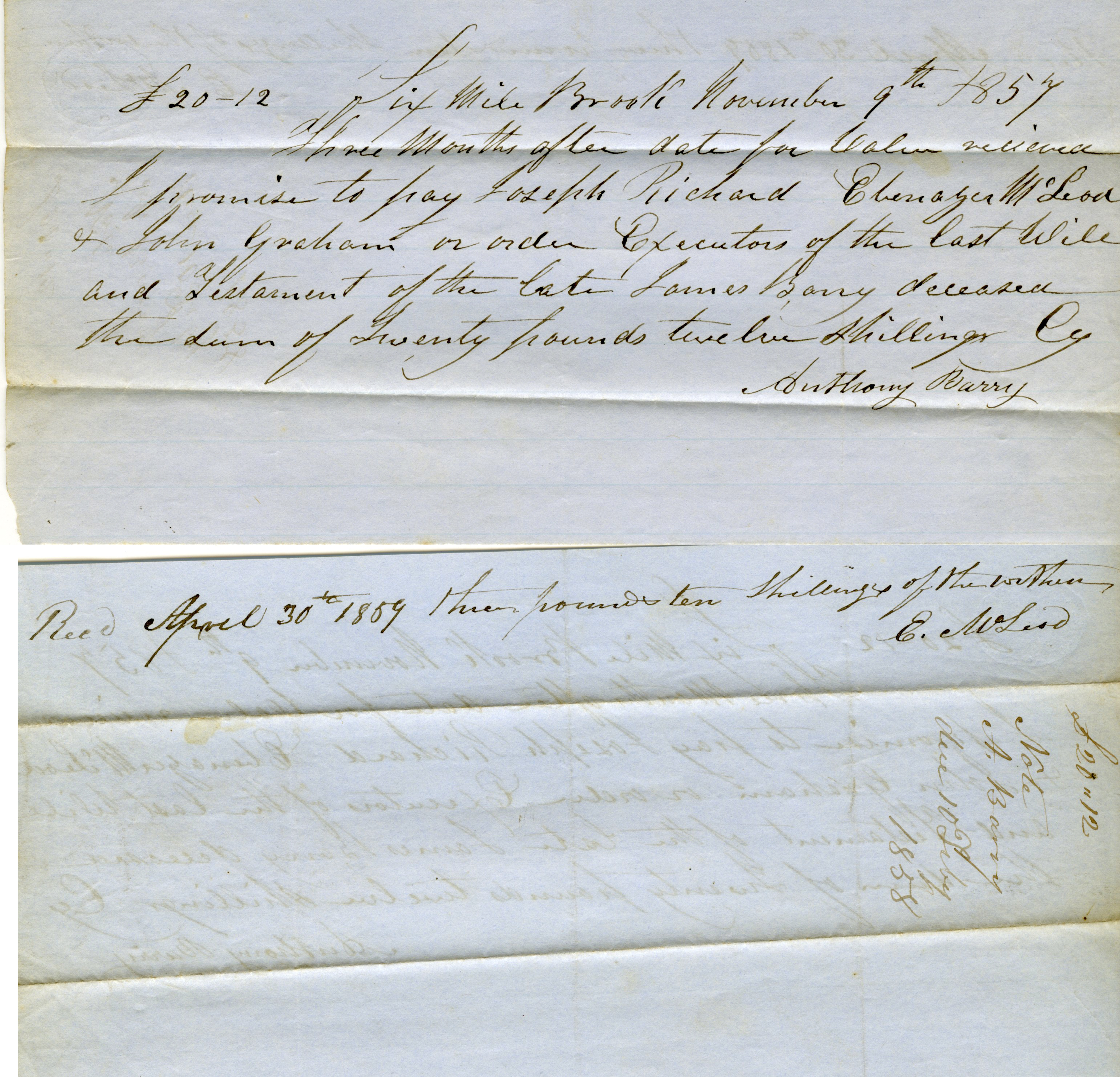 Three months after date for value received I promise to pay Joseph Richard, Ebenezer McLeod and John Graham or order Executors of the last Will and Testament of the late James Barry deceased the sum of Twenty pounds twelve shillings.