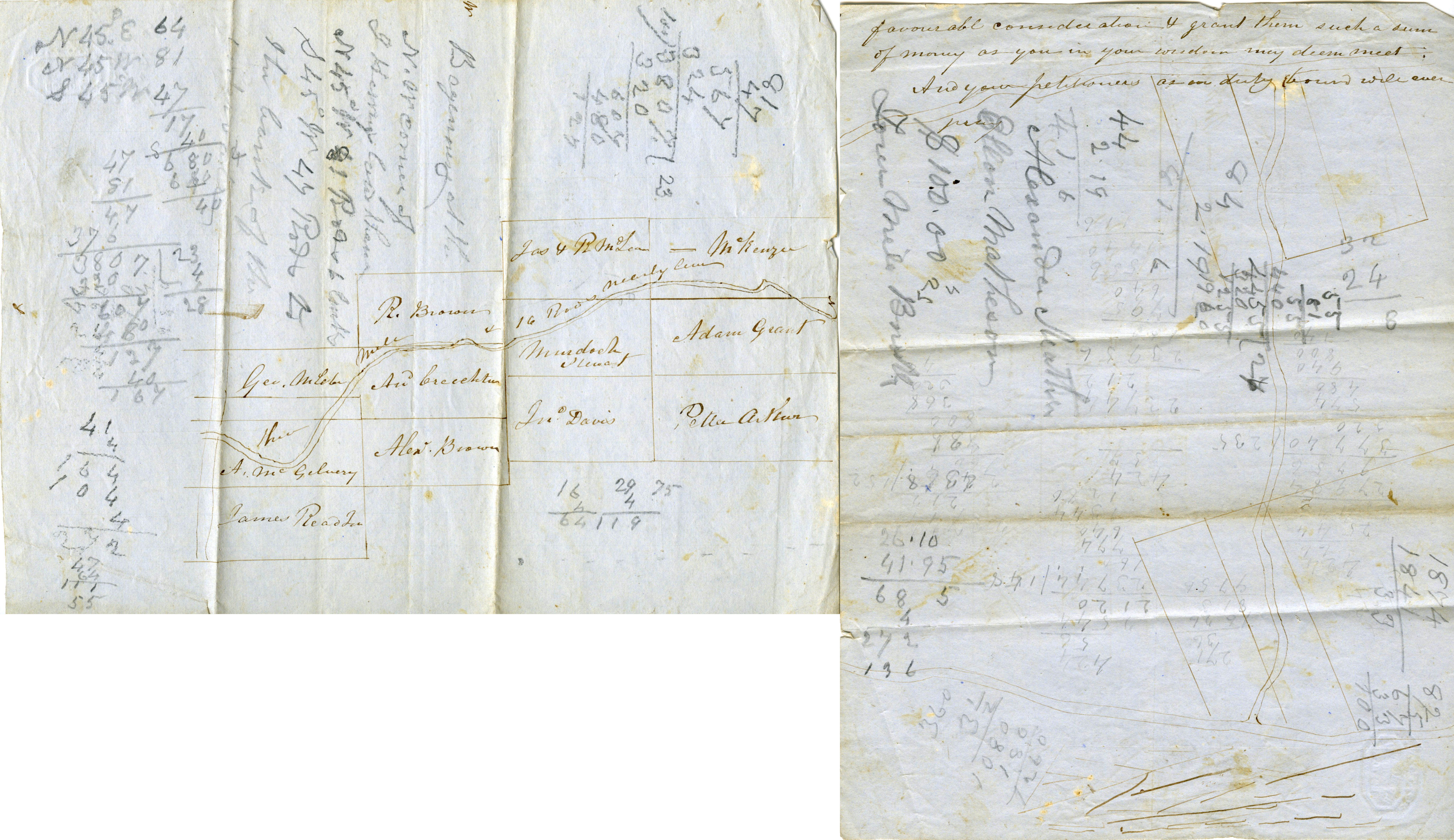 Names on plots are George McCabe, A. McGelury, James Read, Alexander Brown, Andrew Creighton,R. Brown, James McLean (and R. MacLean), ___ McKenzie, Murdock Stewart, John Davis, Peter Arthur, and Adam Grant. The note on the left image include a survey reference of “beginning at the n. w. corner of J. Henry land thence N45° W 41 Rods and cont. S 45°W 47 rods to the lands of…” On the right side image, the ink note is “favourable consideration and grant them such a sum of money as you in your widow deem [meat?]. And you petitioners as in duly towns will ever…” and below the pencil note is “Alexander [Neather?], Ellon Matheson, $100.00 Four Mile Brook.”
