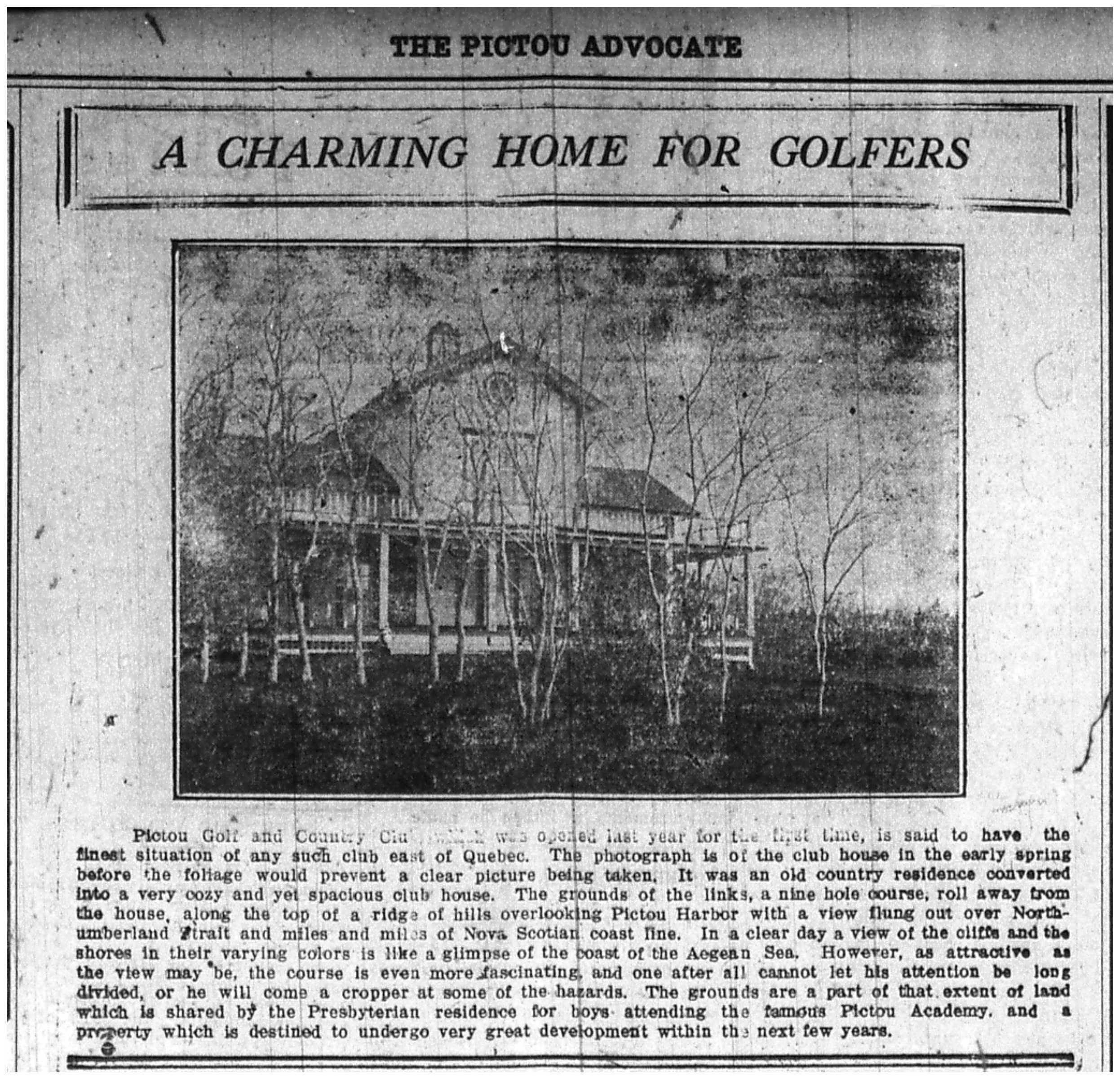 Pictou Golf and Country Club which was opened last year for the first time, is said to have the finest situation of any such club east of Quebec. The photograph is of the club house in the early spring before the foliage would prevent a clear picture being taken. It was an old country residence converted inot a very cozy and yet spacious club house. The grounds of the links, a nine hold course, roll away form the house along the top of a ridge of hills overlooking Pictou Harbour with a veiw flung out over Northumberland Strait and miles and miles of Nova Scotia coast line. In a clear day a view of the cliffs and the shores in their varying colors is like a glimpse of the coast of the Aegean Sea. However, as attractive as the view may be, the course is even more fascinating and one after all cannot let his attention be long divided, or he will come a cropper at some of the hazards. The grounds are a part of that extent of land which is shared by the Presbyterian residence for boys attending the famous Pictou Academy and a property which is destined to undergo very great development within the next few years.