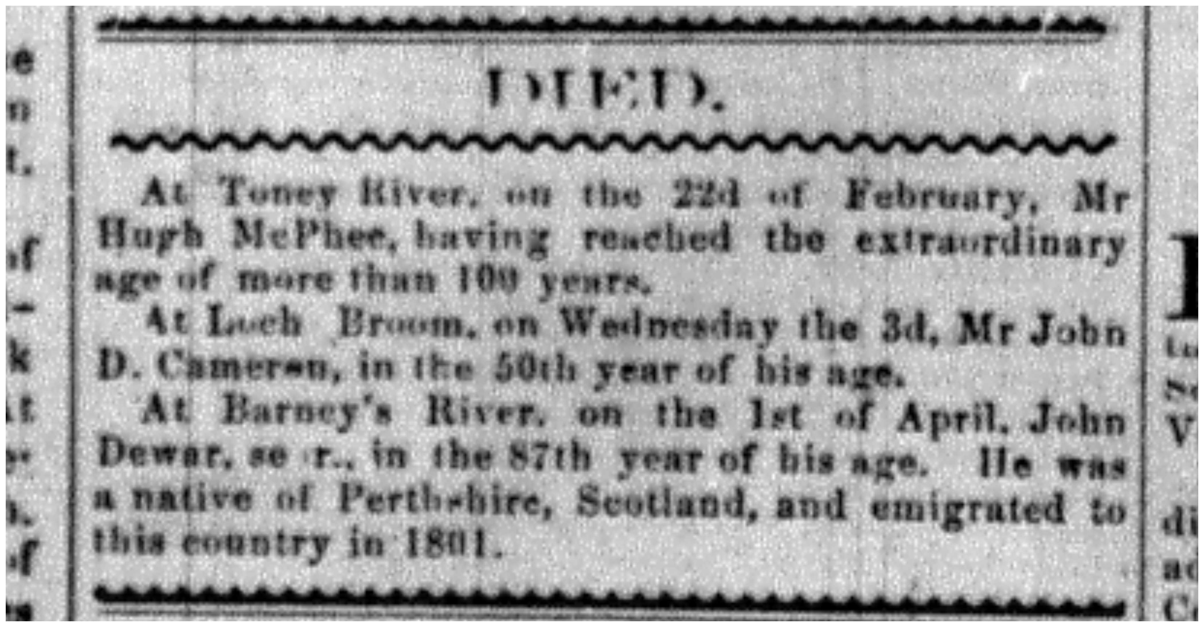 | Tags: | Eastern Chronicle, newspaper, obituary, John Dewar, John D. Cameron, Hugh McPhee, Toney River, Loch Broom, Barney's River |